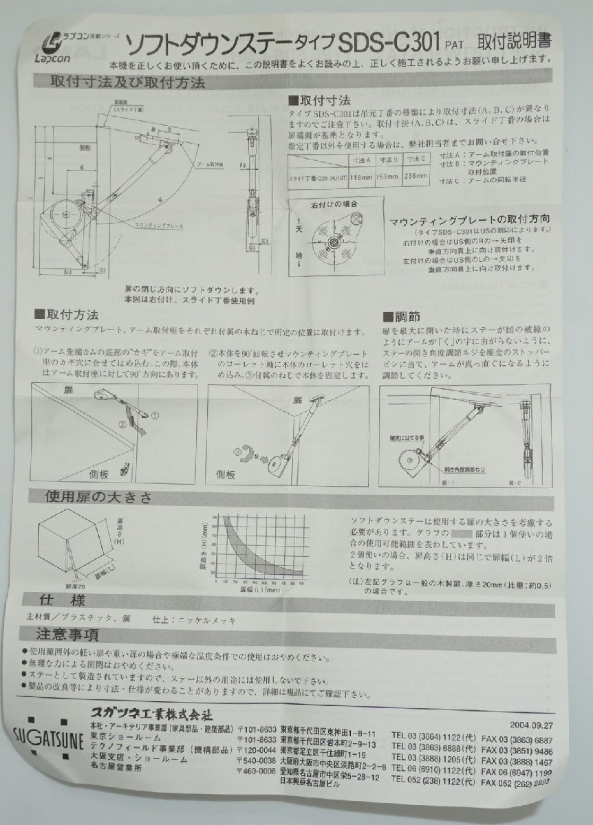 LAMP ソフトダウンステーSDS-C301(ホワイト)上開き扉用 キャッチ付ラプコンステー ダンパーステー未使用で袋に入ってますが、長期在庫品、売切りの為、オイルにじみや焼け有り。スガツネ廃番品クリックポストにて発送スガツネ工業(LAMP)のソフトダウンステー SDS-C301/wラプコン機構【仕様】キャッチ付【主材料】プラスチック、鋼【仕上】ニッケルめっき【色】ホワイト【扉開き角度】80°【付属品】マウンティングプレート SDS-A、 十字穴付皿タッピンねじ3.5×14
