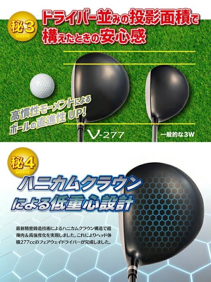 商品説明 | 圧倒的な優しさと飛距離!大型ヘッドフェアウェイドライバー「PARALLAX V-277」(パララックスV-277) Lynx リンクス PARALLAX パララックス V-277 フェアウェイ ドライバー 深く低い重心設計で、高弾道・低スピンのビッグキャリー 低重心・深重心設計により、ボールが高く上がりやすくスピンも抑制。 フェアウェイから しっかりとした打ち出しと伸びのある弾道で、大きな飛距離を実現します。 ・フェース高33mm で球を拾いやすくフェアウェイから安心して狙える設計! 一般的な3Wよりフェース高が低く、より打ち出しが高くなる。 ・ドライバー並みの投影面積で構えたときの安心感 高慣性モーメントによるボールの直進性UP! ・ハニカムクラウンによる低重心設計 最新精密鋳造技術によるハニカムクラウン構造で超薄肉&高強度化を実現しました。 これによりヘッド体積277ccのフェアウェイドライバーが完成しました。 |
