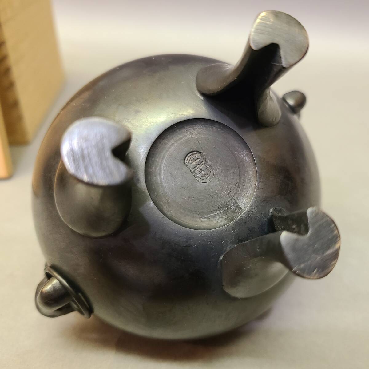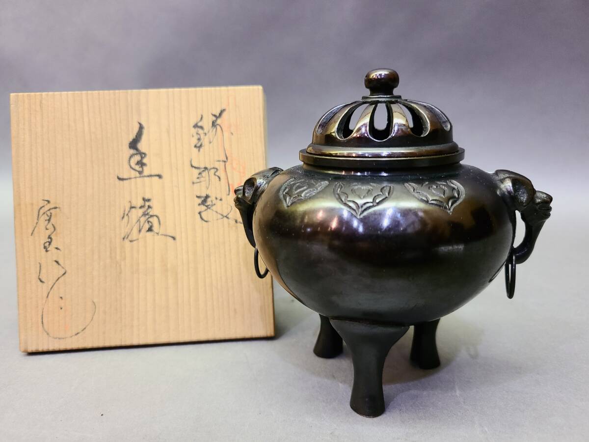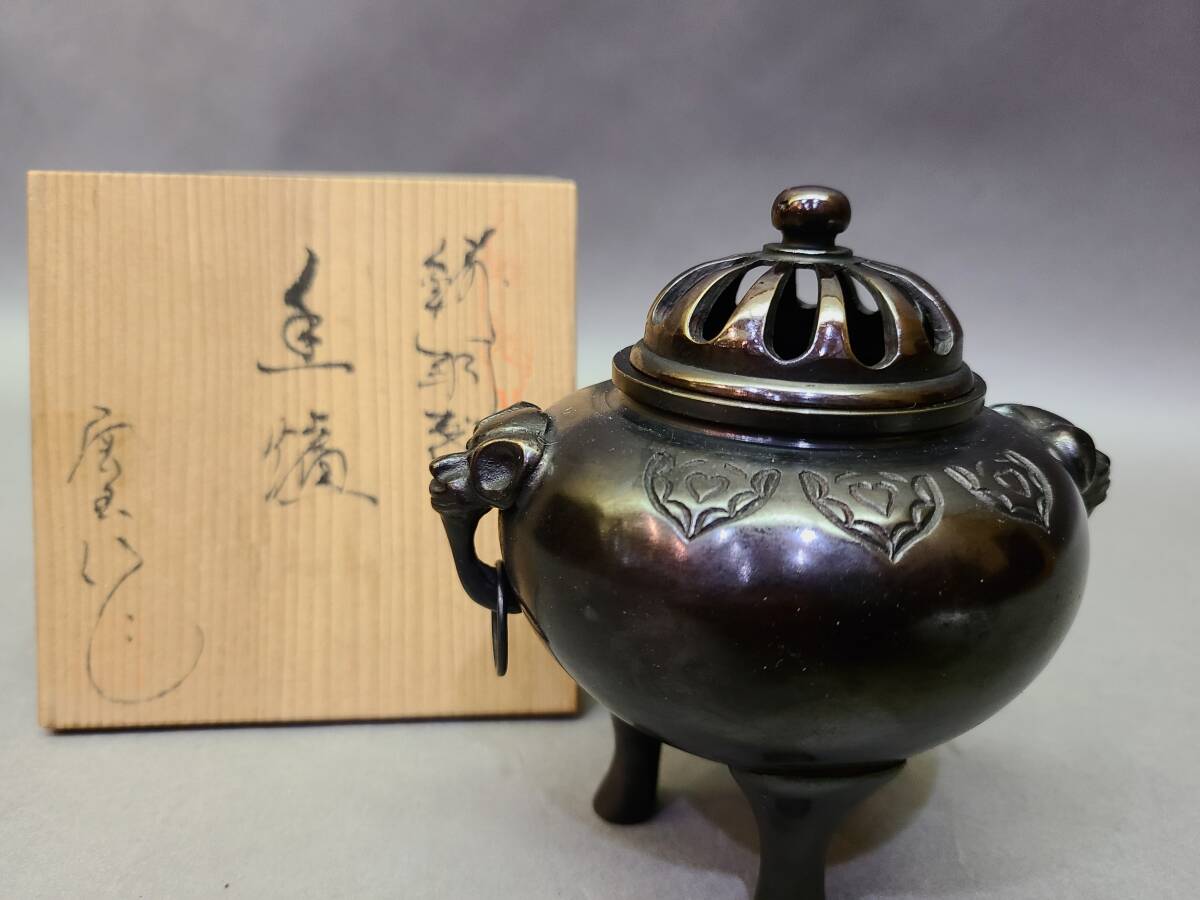 ◆銅造 在銘入 三足獅子耳 香炉 共木箱◆ 香道具煎茶道具茶器古銅花器華道具