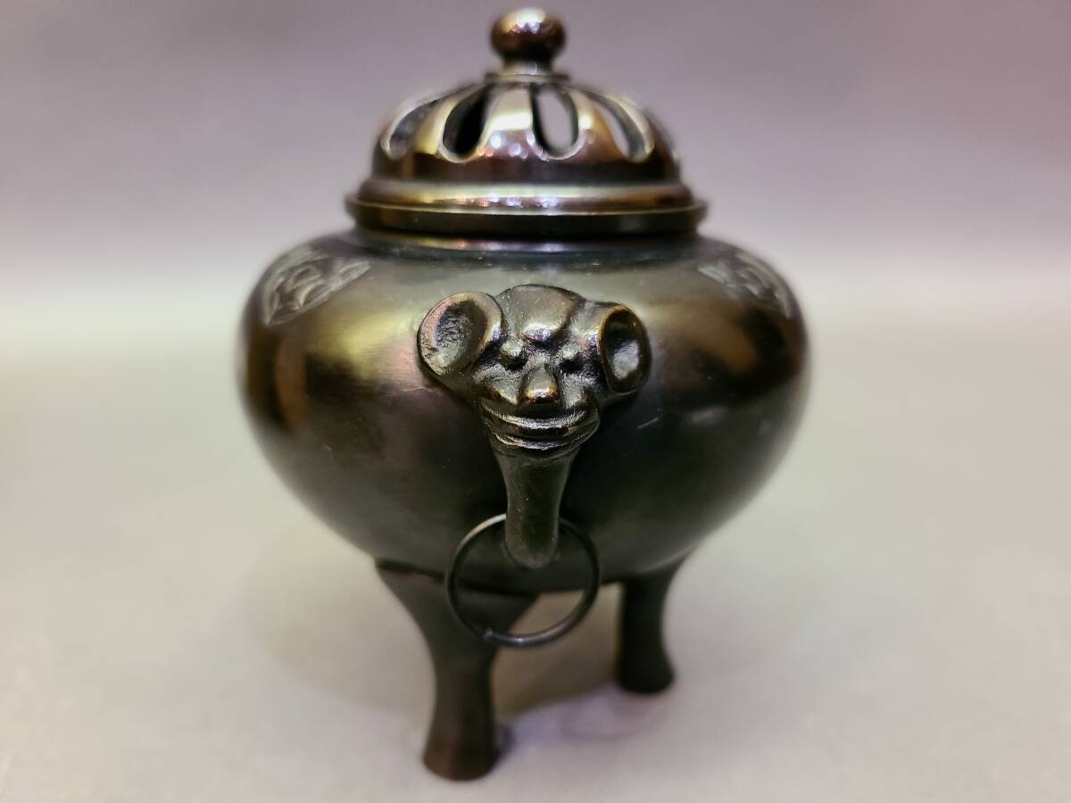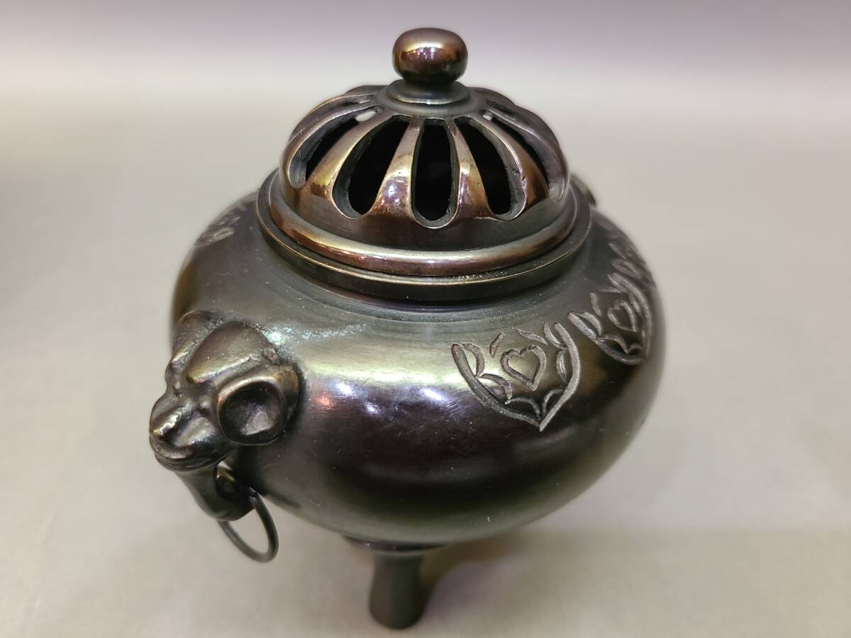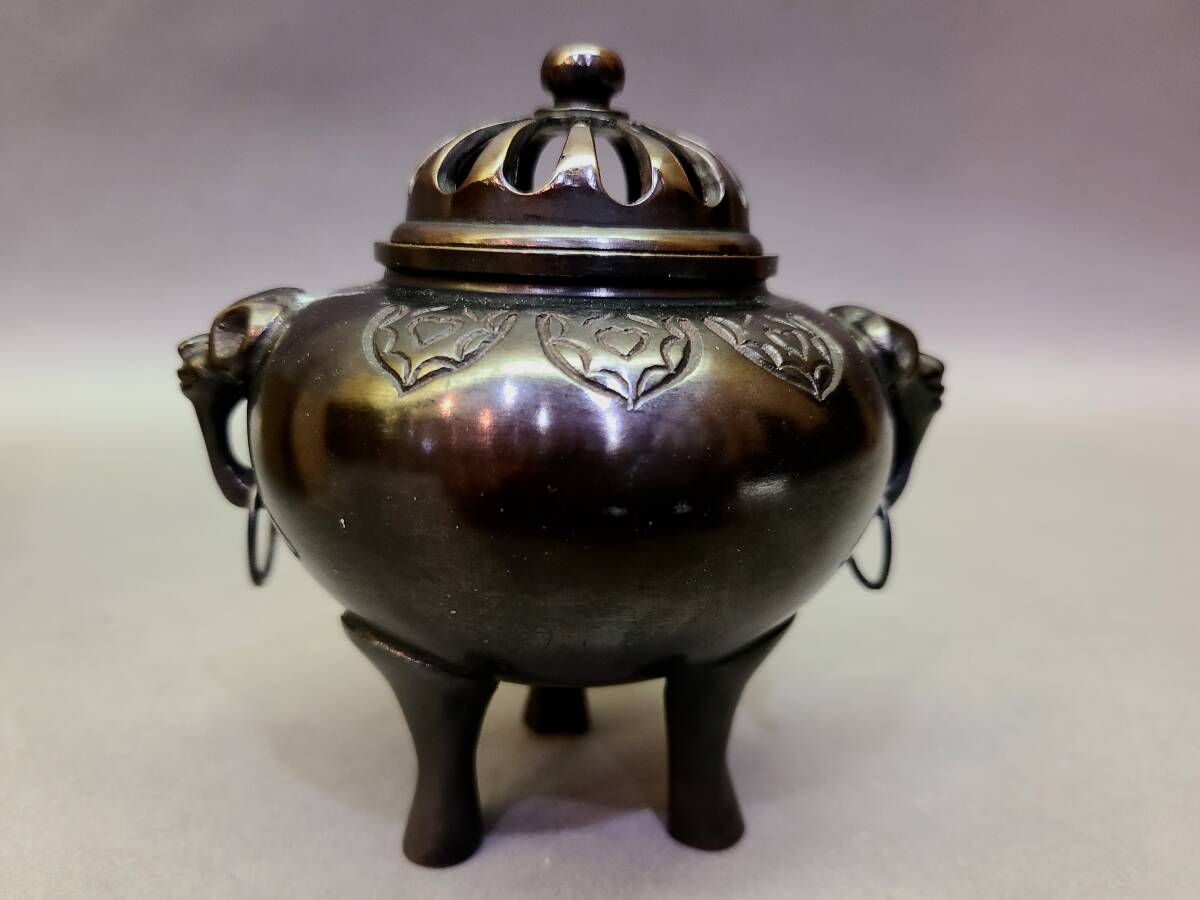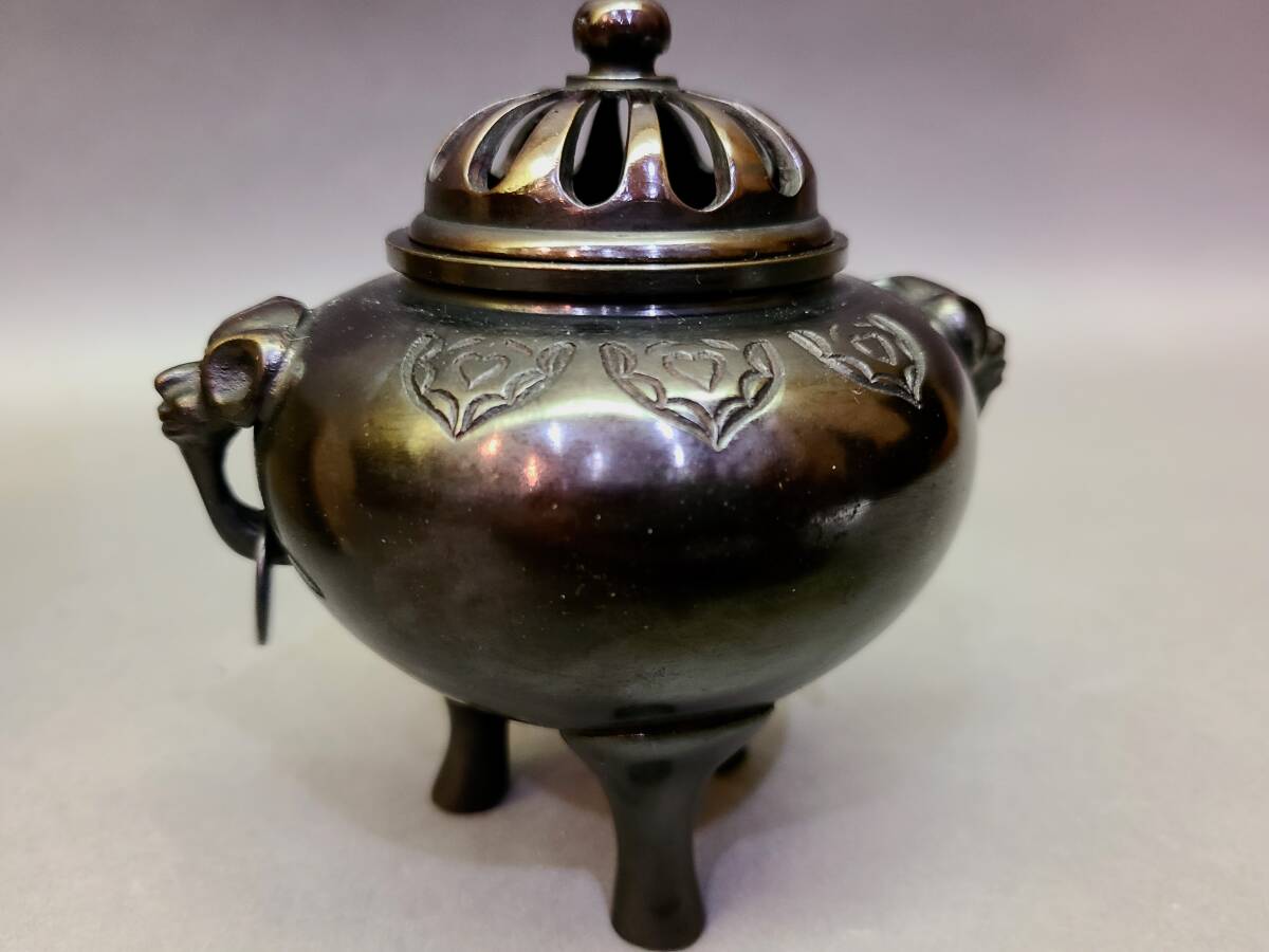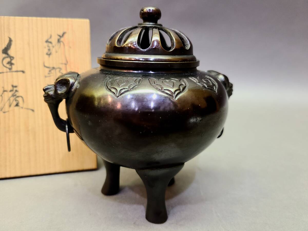大変素晴らしい、銅造 在銘入 三足獅子耳 香炉 共木箱です!