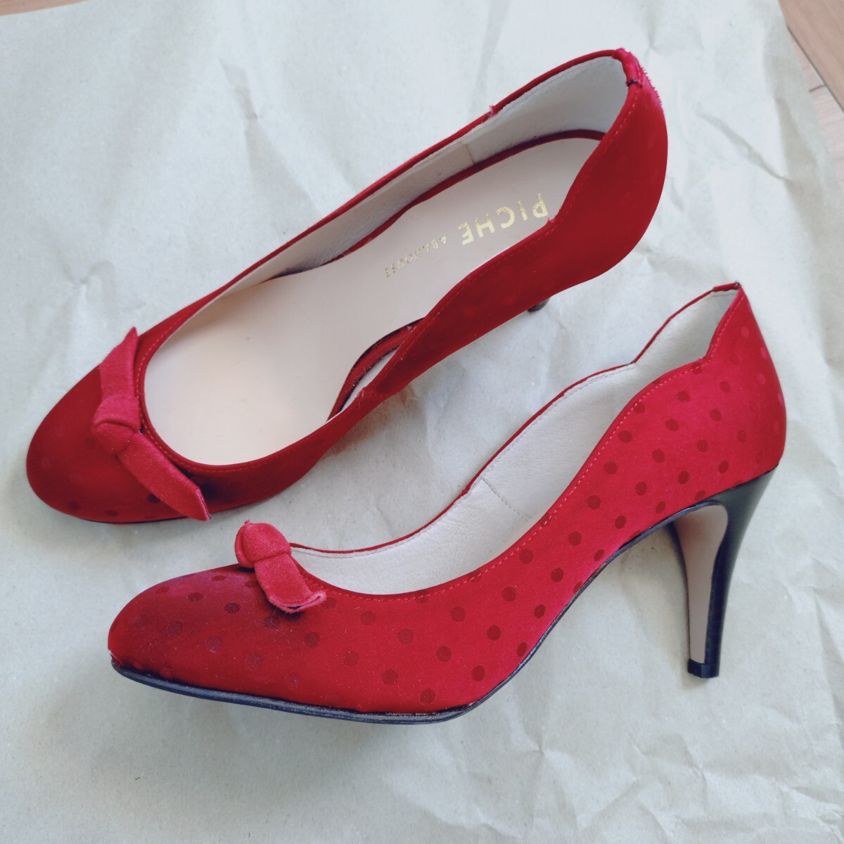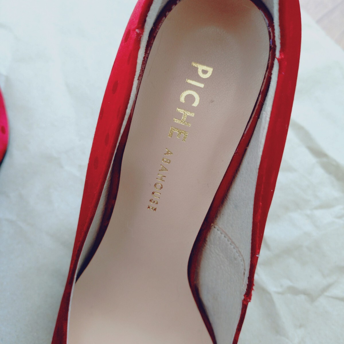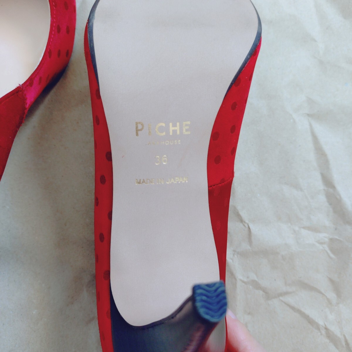 【23cm・未使用・難あり】PICHE ABAHOUSE水玉模様サテン生地日本製ハイヒールパンプスピシェアバハウス布張りドット柄平成レトロ赤レッド