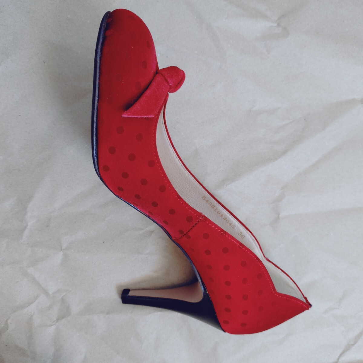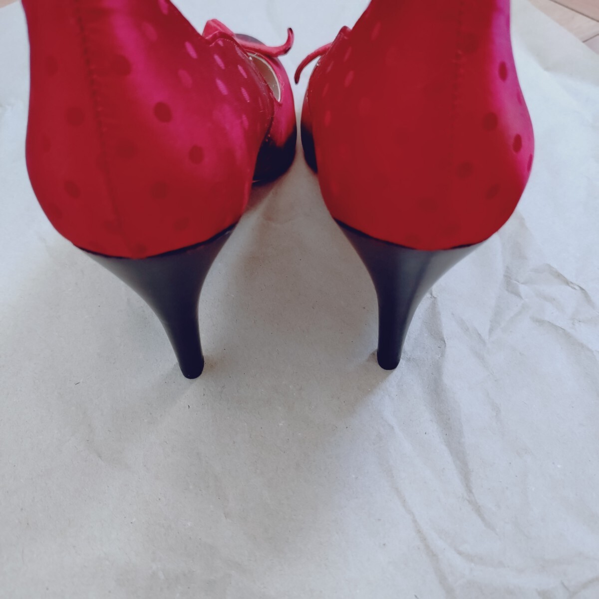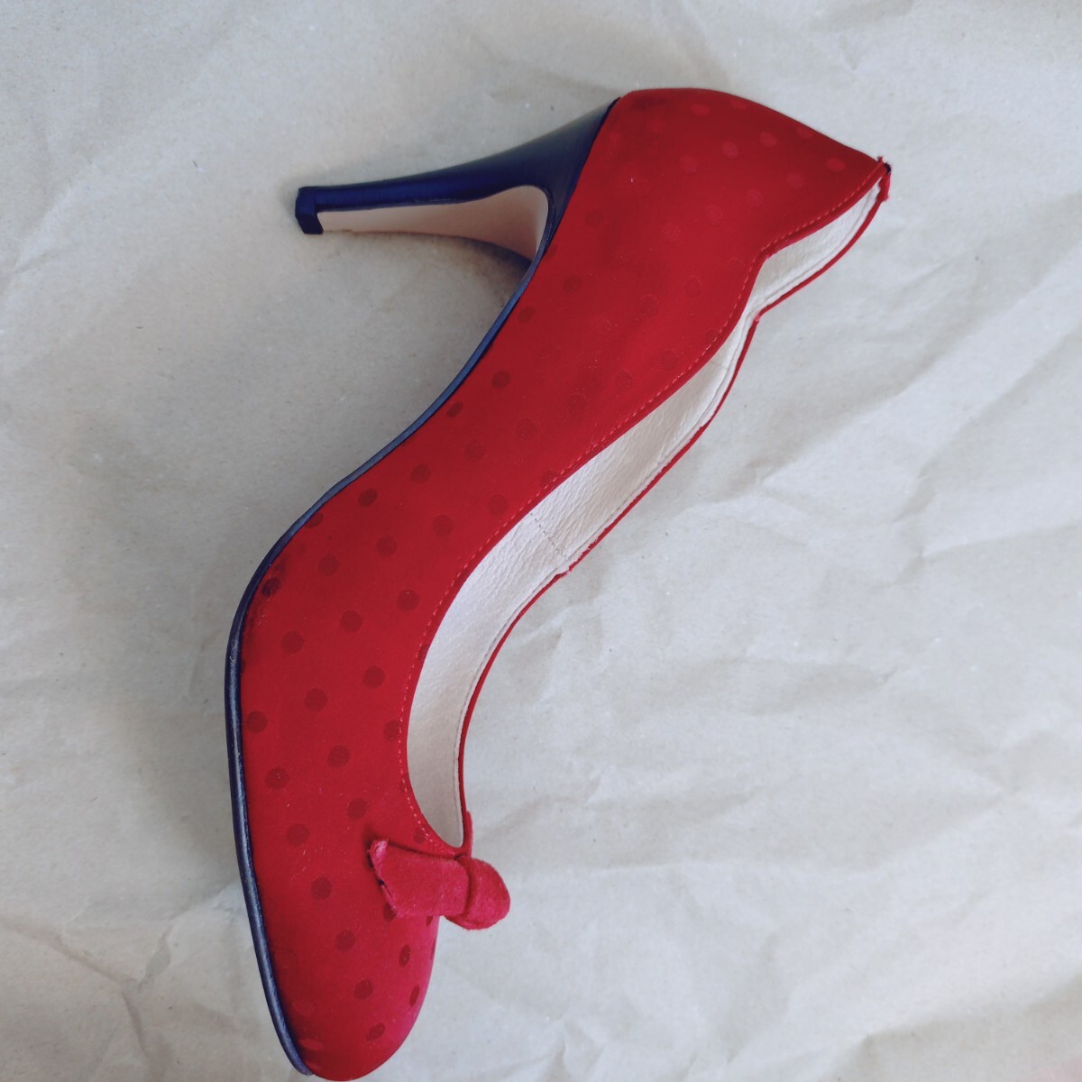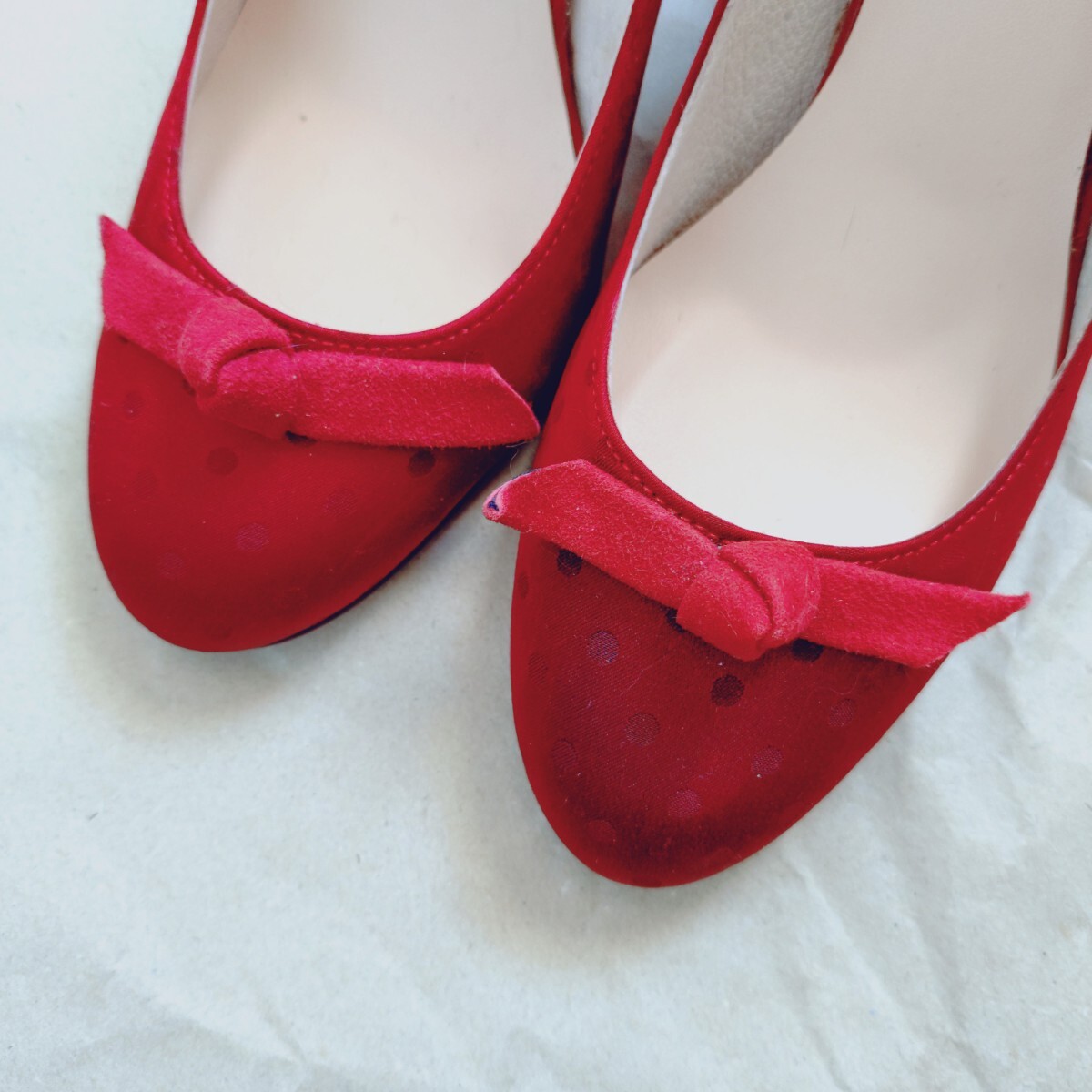 【23cm・未使用・難あり】PICHE ABAHOUSE水玉模様サテン生地日本製ハイヒールパンプスピシェアバハウス布張りドット柄平成レトロ赤レッド