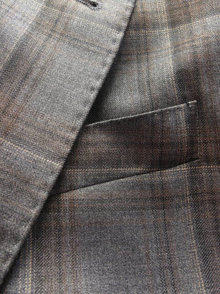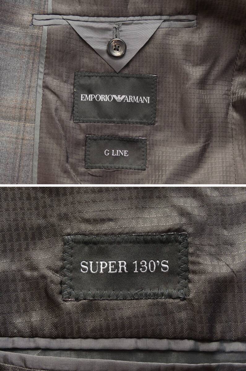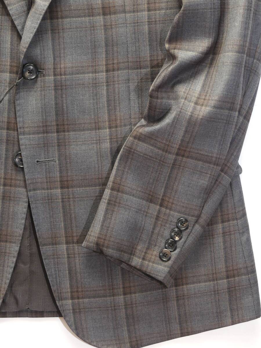 見るからに上質、見るからに高級なSUPER130’Sブレザー。プレフォールと言うことで秋の雰囲気を感じるブラウングラデーションのウインドウペーン。とても洒落た一着です。スーパーキメ細かな超細番手SUPER130’Sウール100%の中厚手ソリッド生地。130クラスならではの美しい艶が見事。仕立ては手縫いハンドメイドを多用した本格テーラード。着心地も肌触りも完全にエグゼクティブ向けアッパークラス。そしてアルマーニならではの洒落た生地。ファッション、クオリティー、テクニック、すべての要素がハイレベルで満たされた上級者向けのテーラード物。さすがに20万円越えの超高級ブレザー、納得の見事な出来栄えです。中厚手生地に総裏地仕上げで着用シーズンは秋冬春の3シーズンになります。