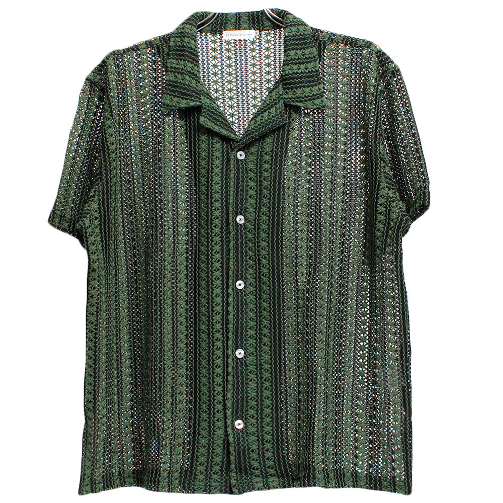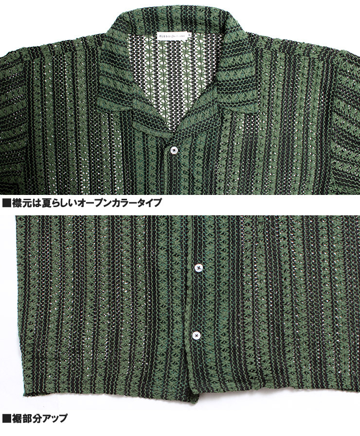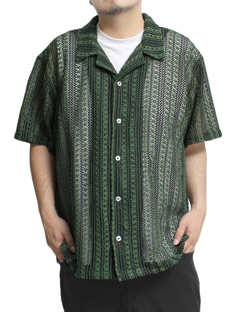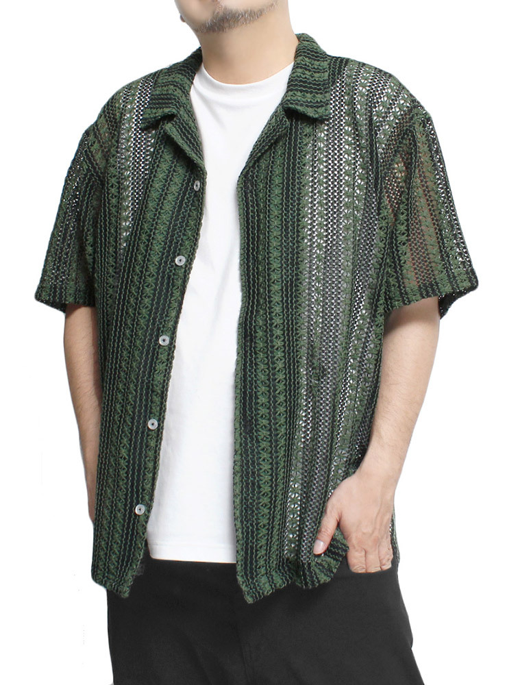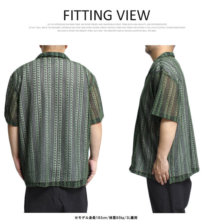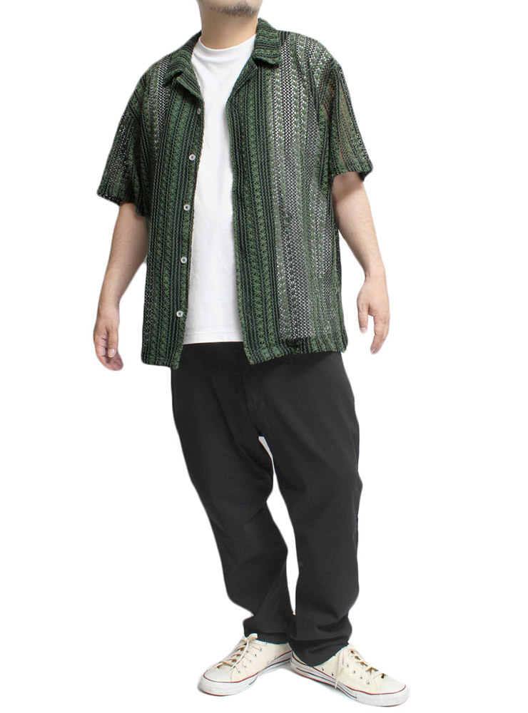 | 商品名 | 【新品】 6L グリーン メッシュ 半袖シャツ メンズ 大きいサイズ ゆったり 透け感 総柄 バルファ レース ストライプ オープンカラーシャツ |
