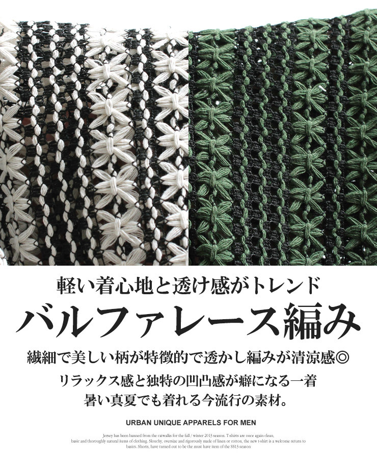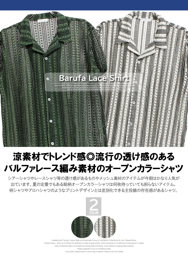 | 商品説明 | トレンド感のある透け感のあるバルファレース編み素材のオープンカラーシャツの登場です。 |