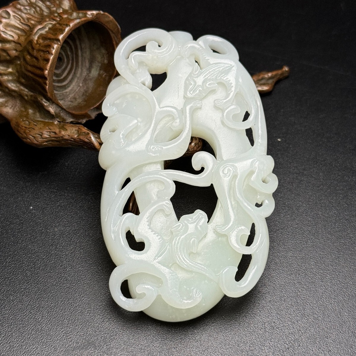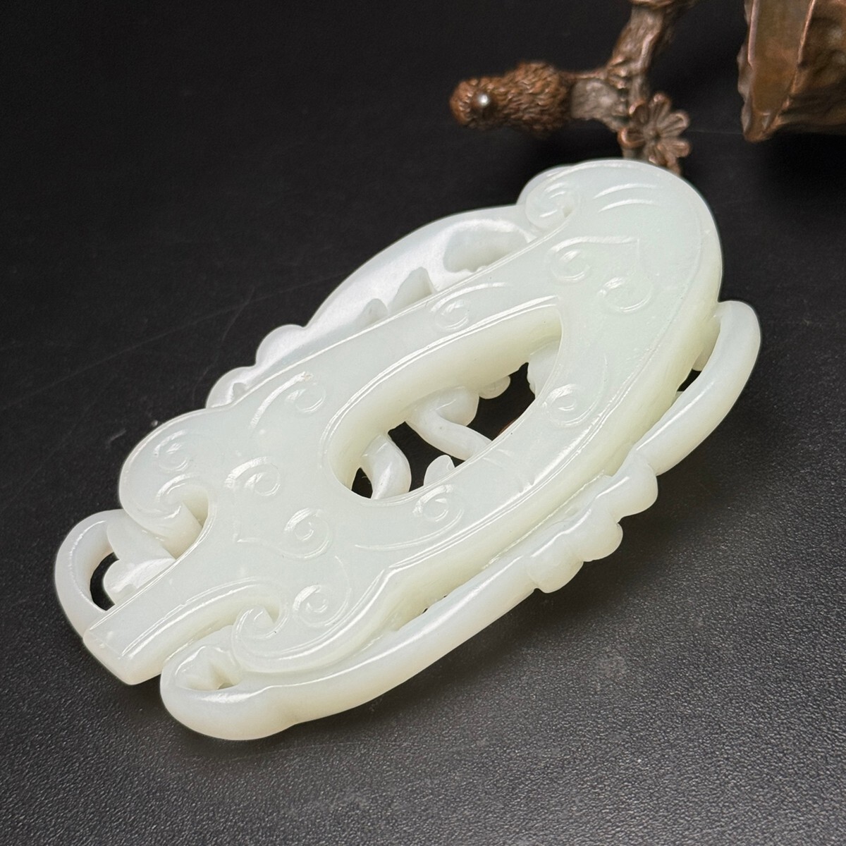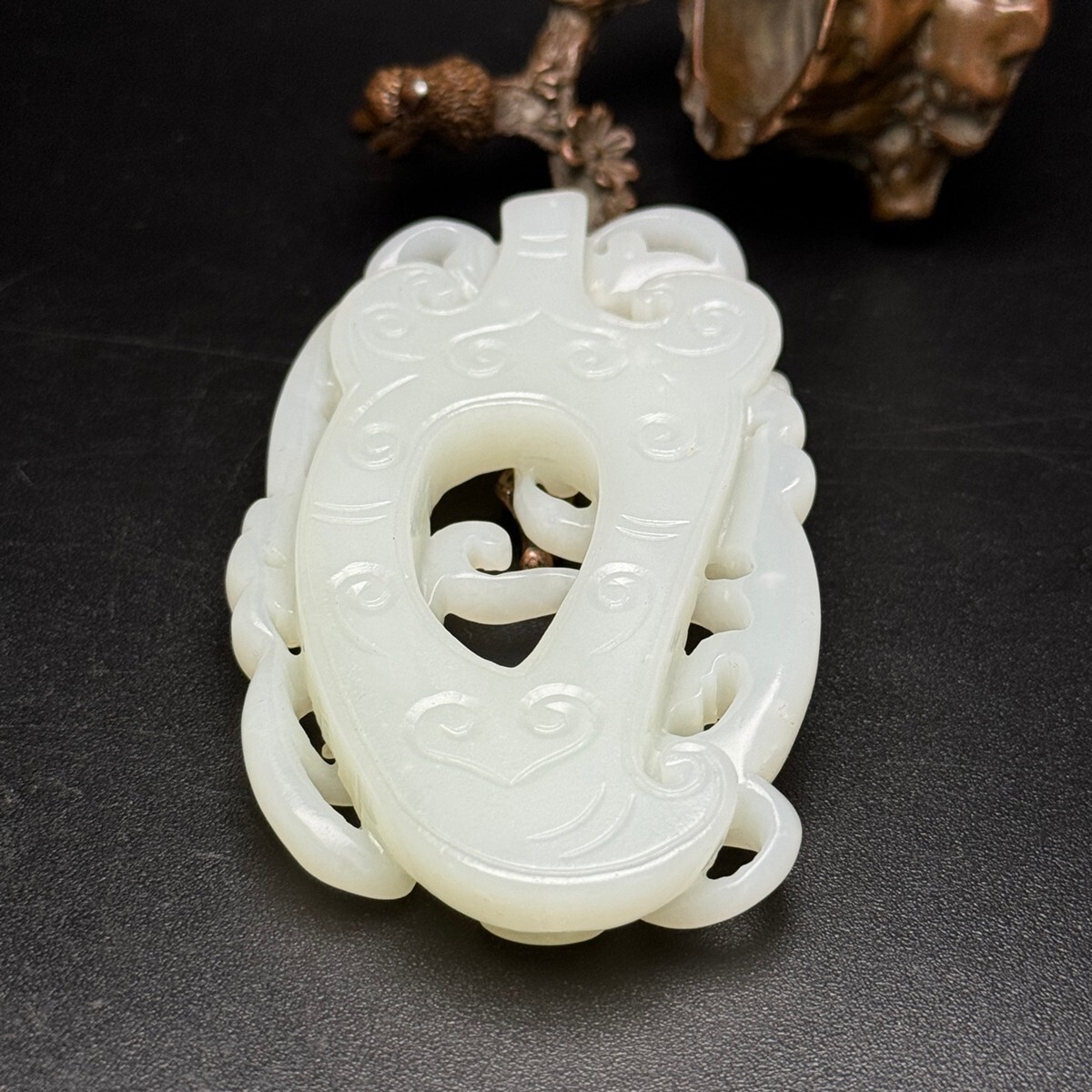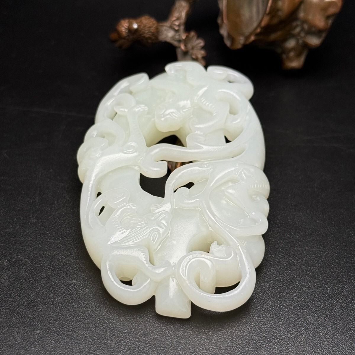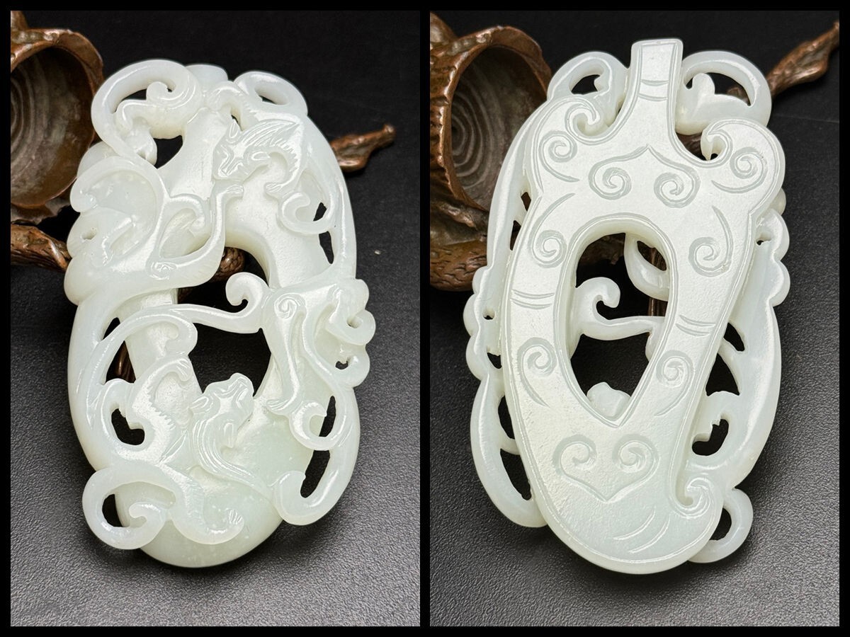 「時代物 和田玉 白玉彫り 龍行天下 招財納福 魑龍 玉佩」極細工 裝身具 賞物 中国古美術 旧蔵出