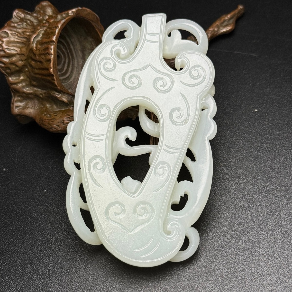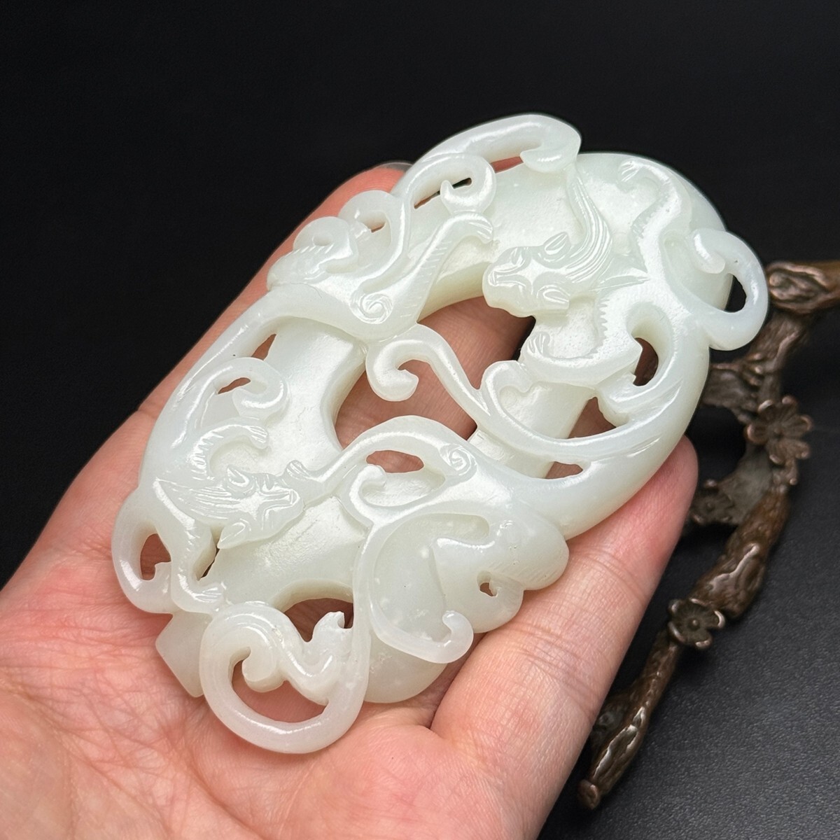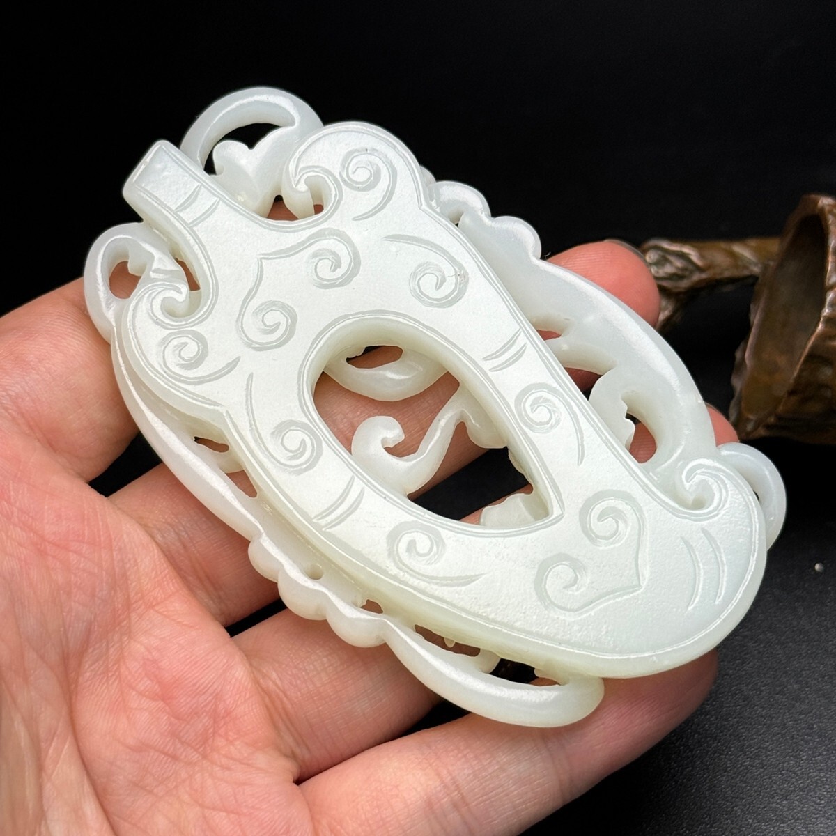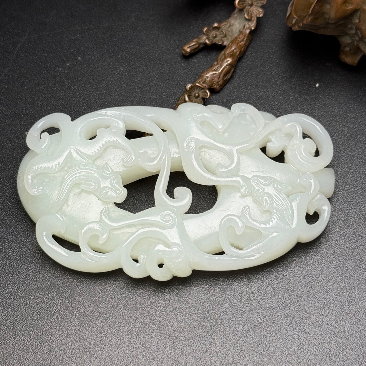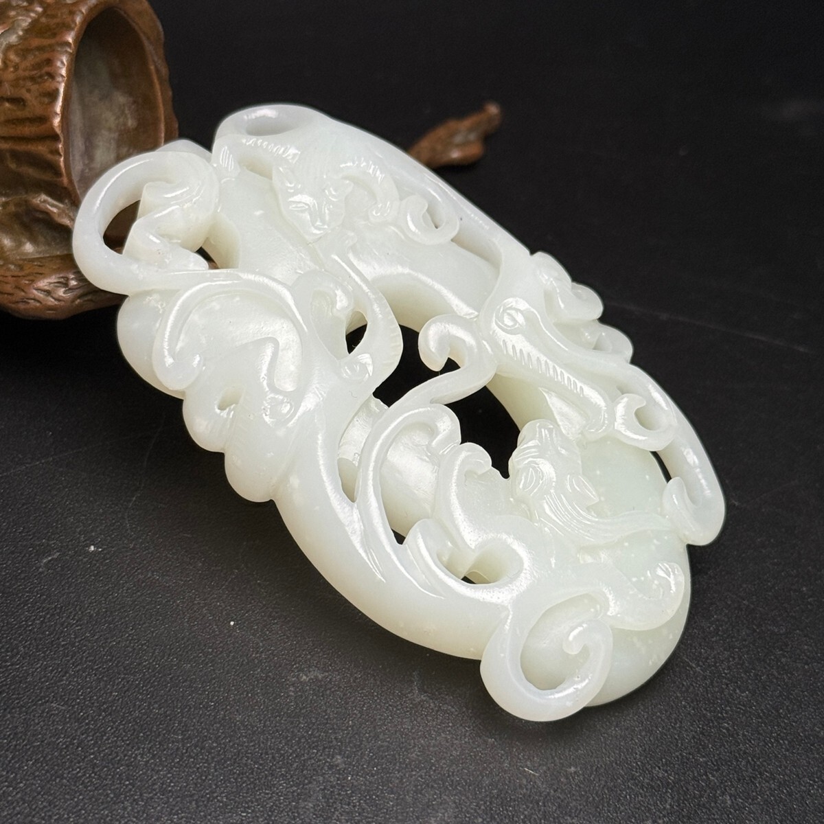 「時代物 和田玉 白玉彫り 龍行天下 招財納福 魑龍 玉佩」極細工 裝身具 賞物 中国古美術 旧蔵出