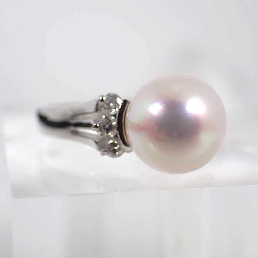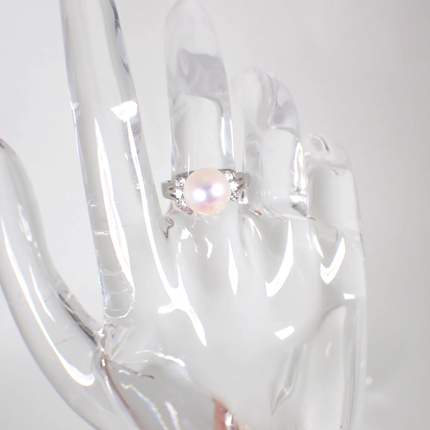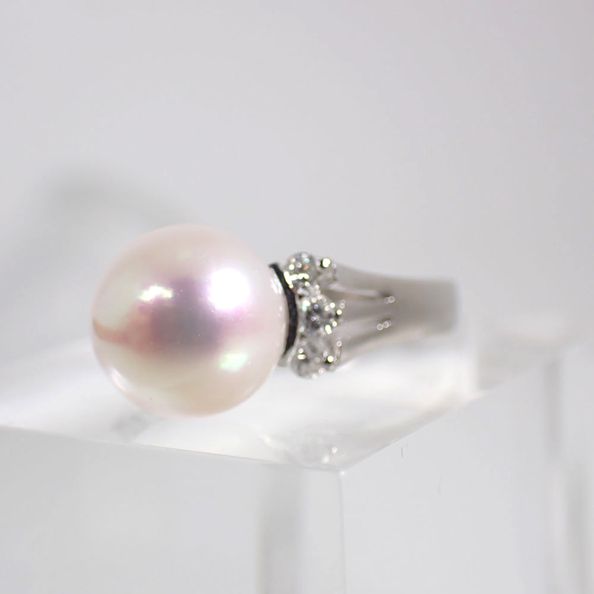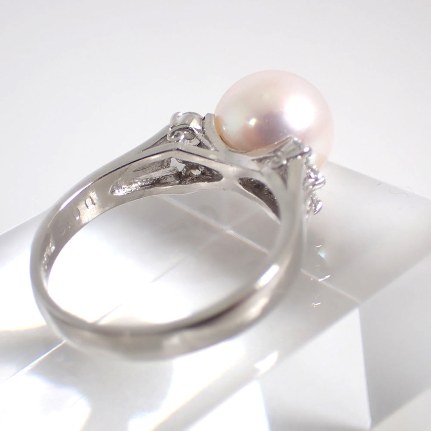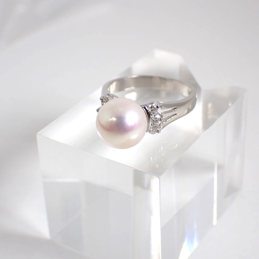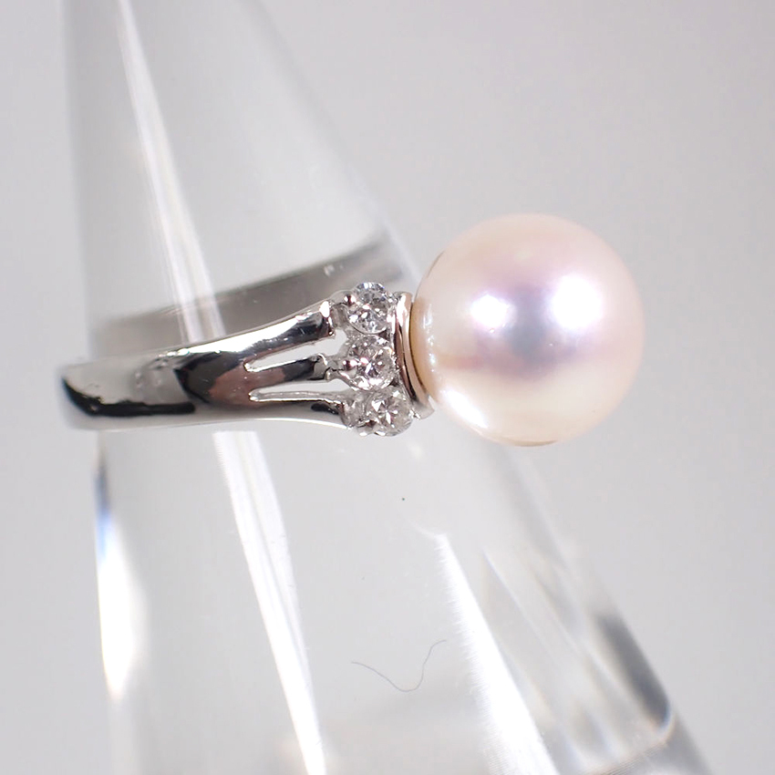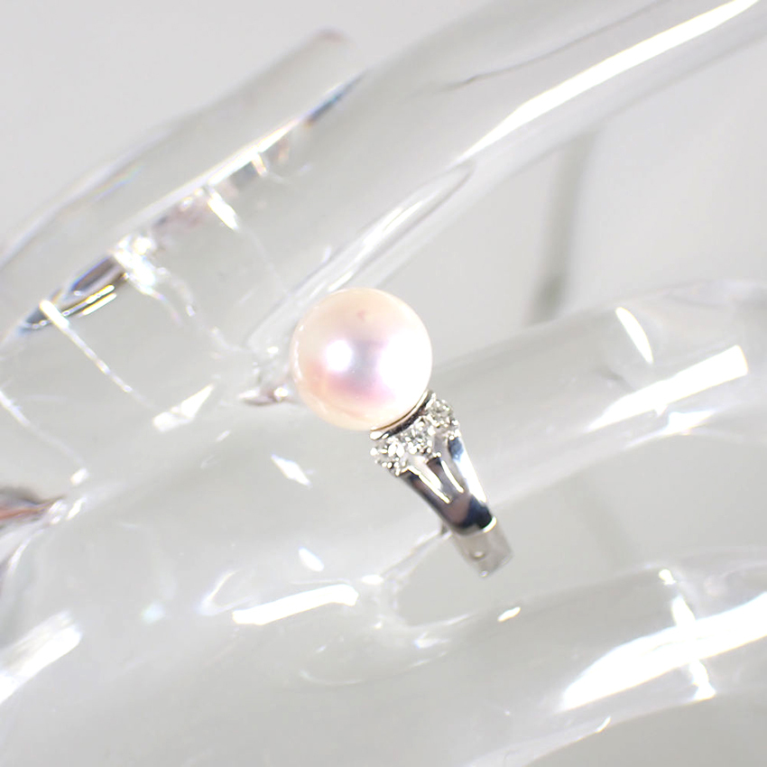ピンク色の照りが強い美しいアコヤ真珠です。両脇に3石づつ計6石のメレダイヤモンドが輝くエレガントなリングです。