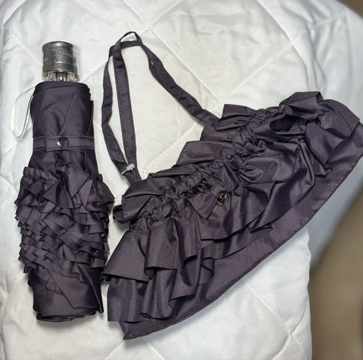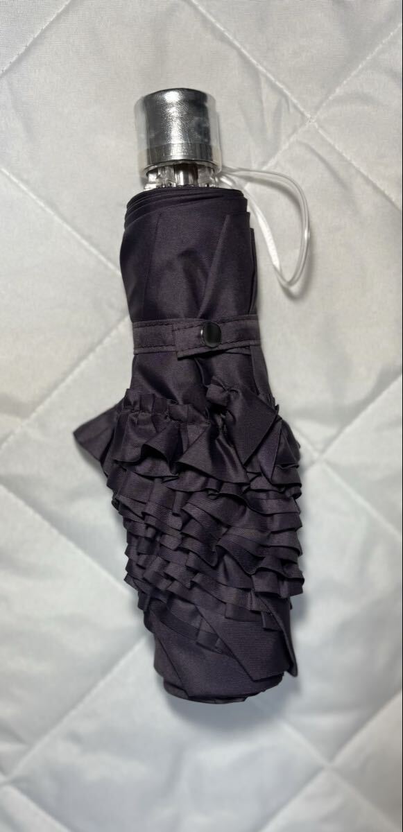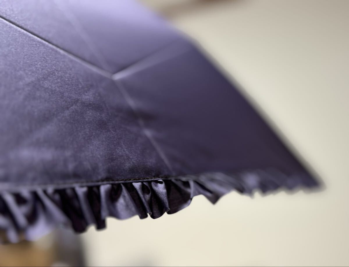控えめで細かなフリルと少し丸みを強調した作りが特徴的な折りたたみ傘です。