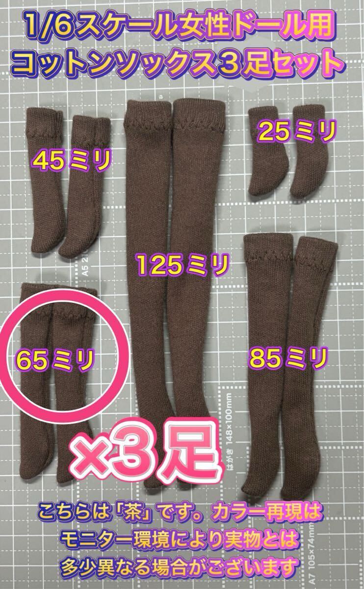 リカちゃん、ジェニー、ネオブライス、アイシードール 、オビツ27女性ボディ、ハッシュタグボディなどが着用出来る、ごくシンプルな綿のソックス長さ違い、平置きで約65ミリの3足セットです。