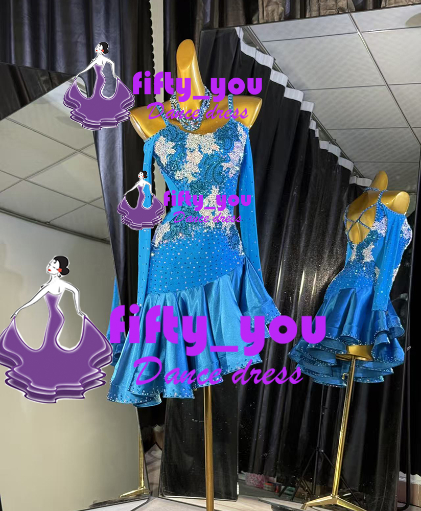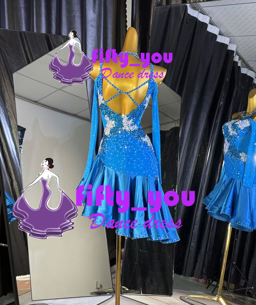 新品fifty_youオリジナル商品レディース社交ダンスドレス  ラテン・ルンバ競技用ドレス セミオーダー 輝きストーン飾り 青色