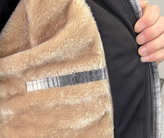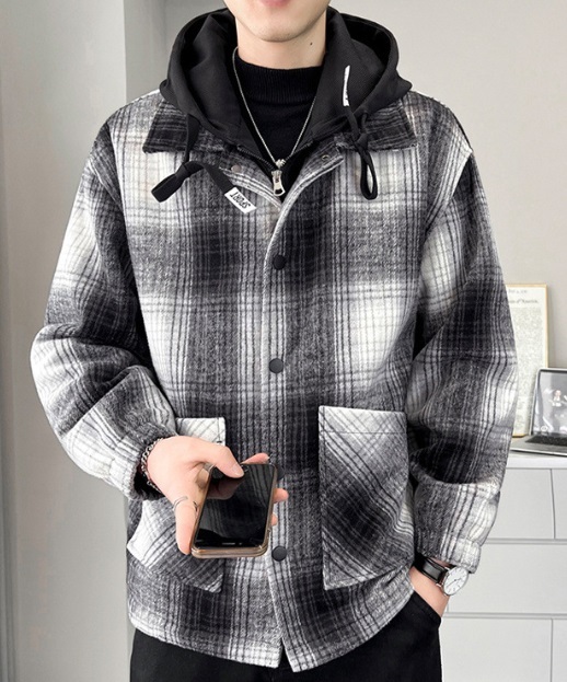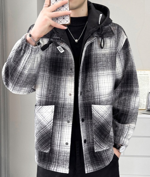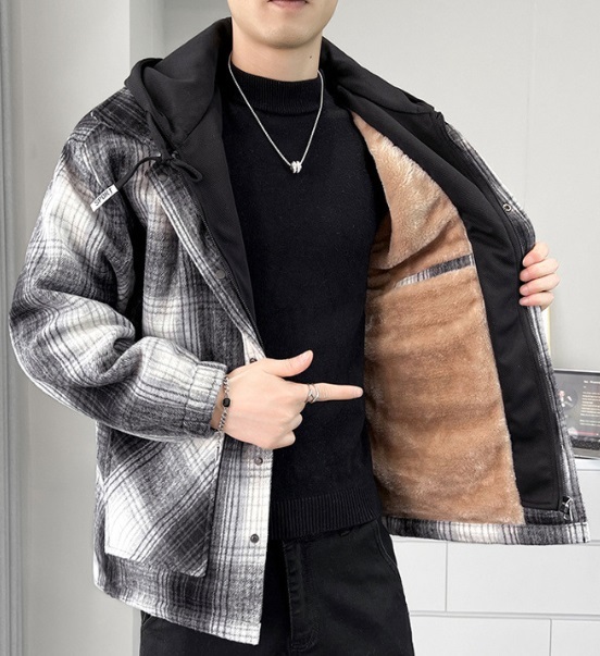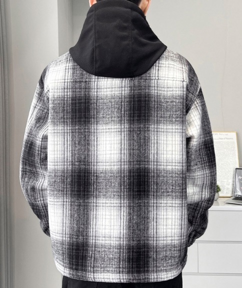 新作 秋冬 ジャケット 裏ボア チェック柄 ブルゾン フェイクインナー 作業服 厚手 アウターフード付き 黒白/2XL