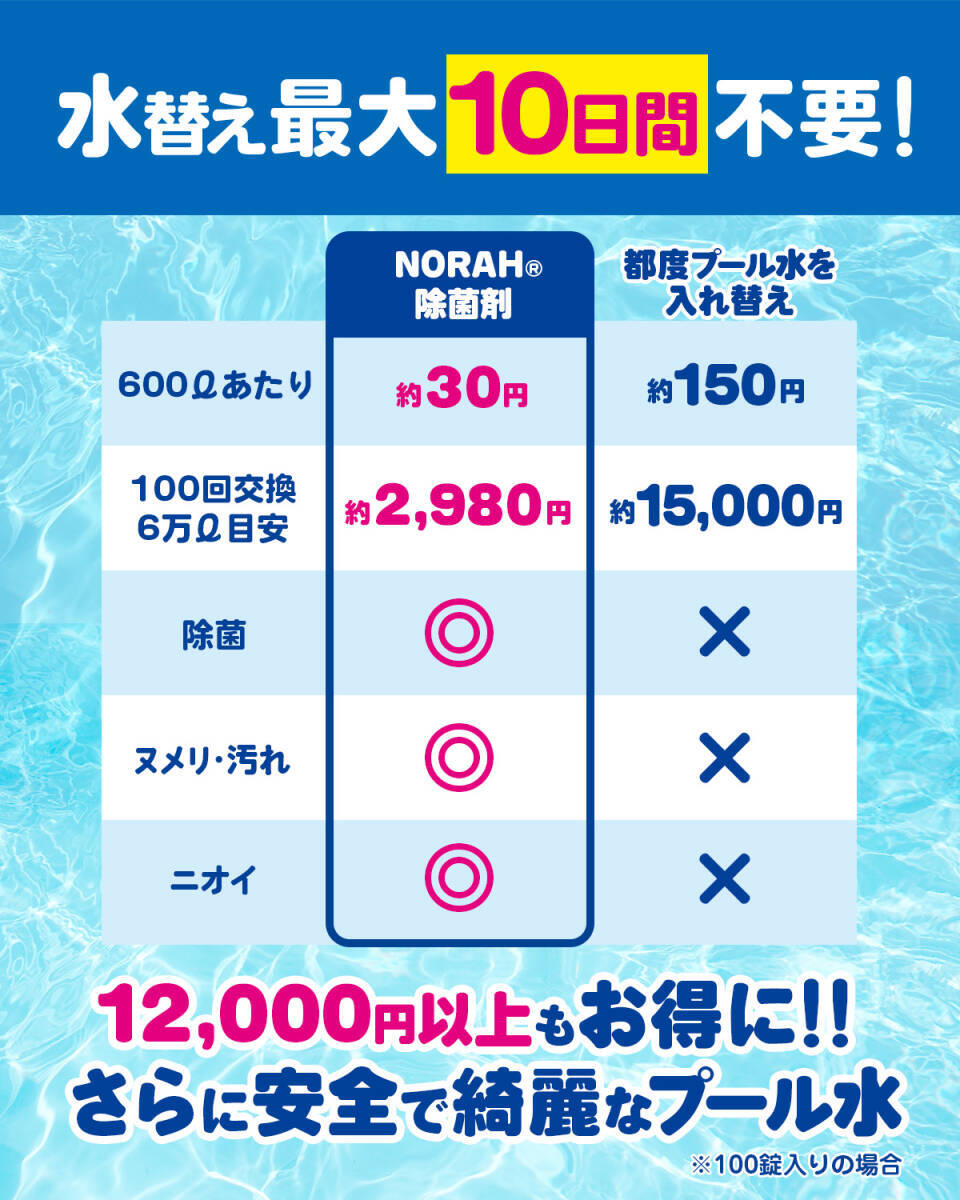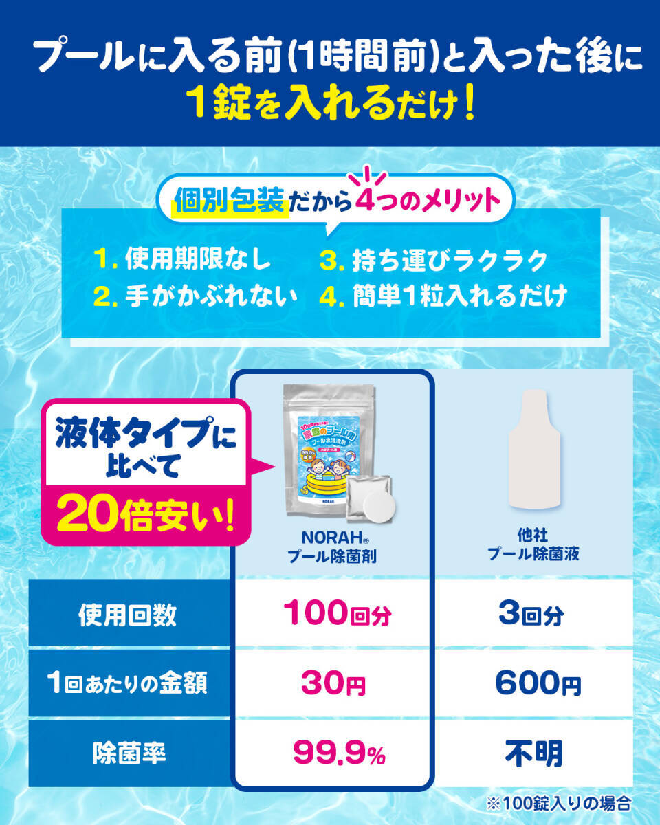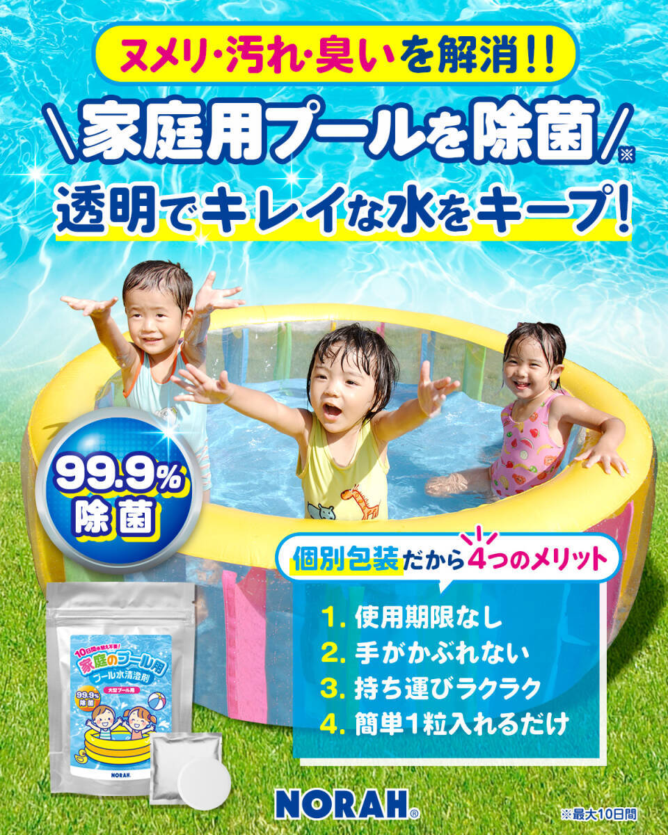 【個別包装だから使いやすい】使用期限なし・持ち運びラクラク・手がかぶれない・簡単1粒入れるだけ 【家庭プール除菌率99.9%】小さなお子様でも安全にご使用いただけご家庭のプールを楽しめます! 【最大10日間水替え不要】水道代を最大16,000円相当節水できます! 【汚れ・ぬめり・臭い解消】お掃除の手間を減らしとお子様の安全にも繋がります。 【安心の日本製・国内工場製造】国内の厳しい品質を合格した認定工場で製造しております。 1. 一口价