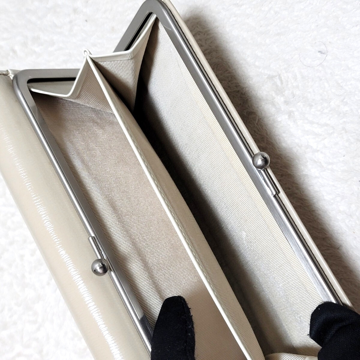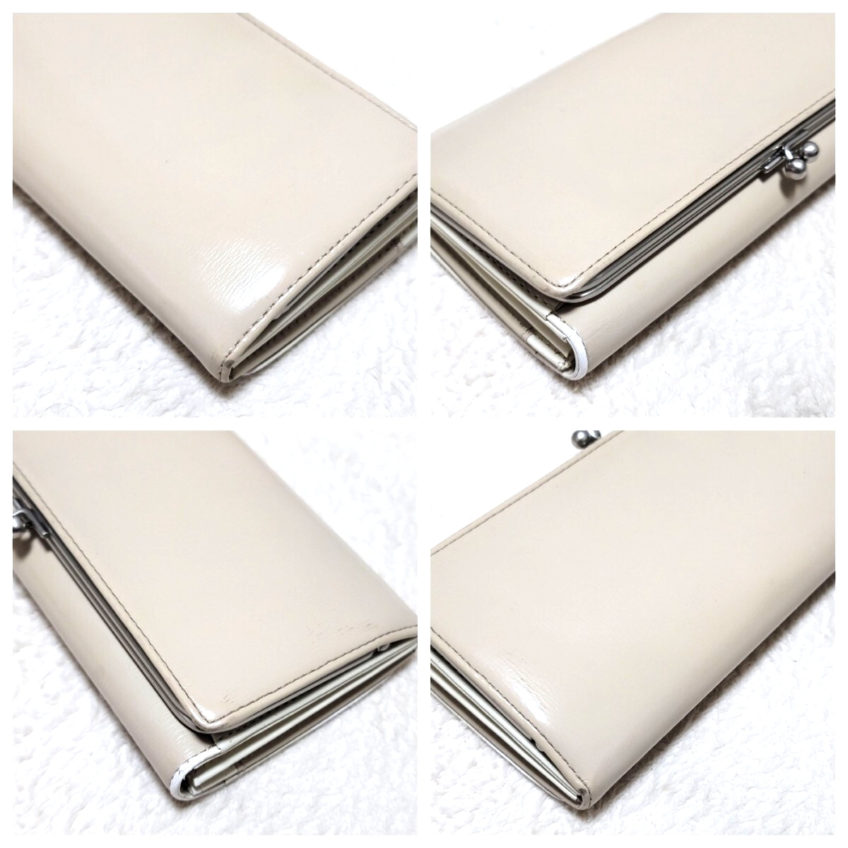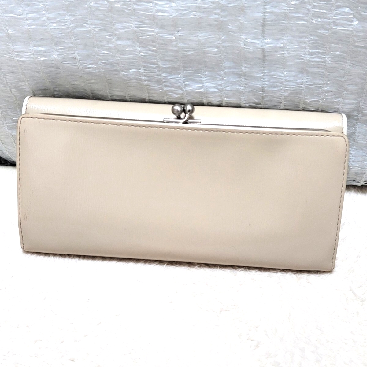 表面色の表現が難しいですがベージュ系にあたるかと思います。内装はホワイトです。札入れ、カード入れ、小銭入れと揃っておりかなり大容量のお財布です。なんだかんだカード類をたくさん入れたい方に特にオススメです。ガマ口の小銭入れも内部が二ヶ所にわかれておりますので小銭管理にも役立ちます。