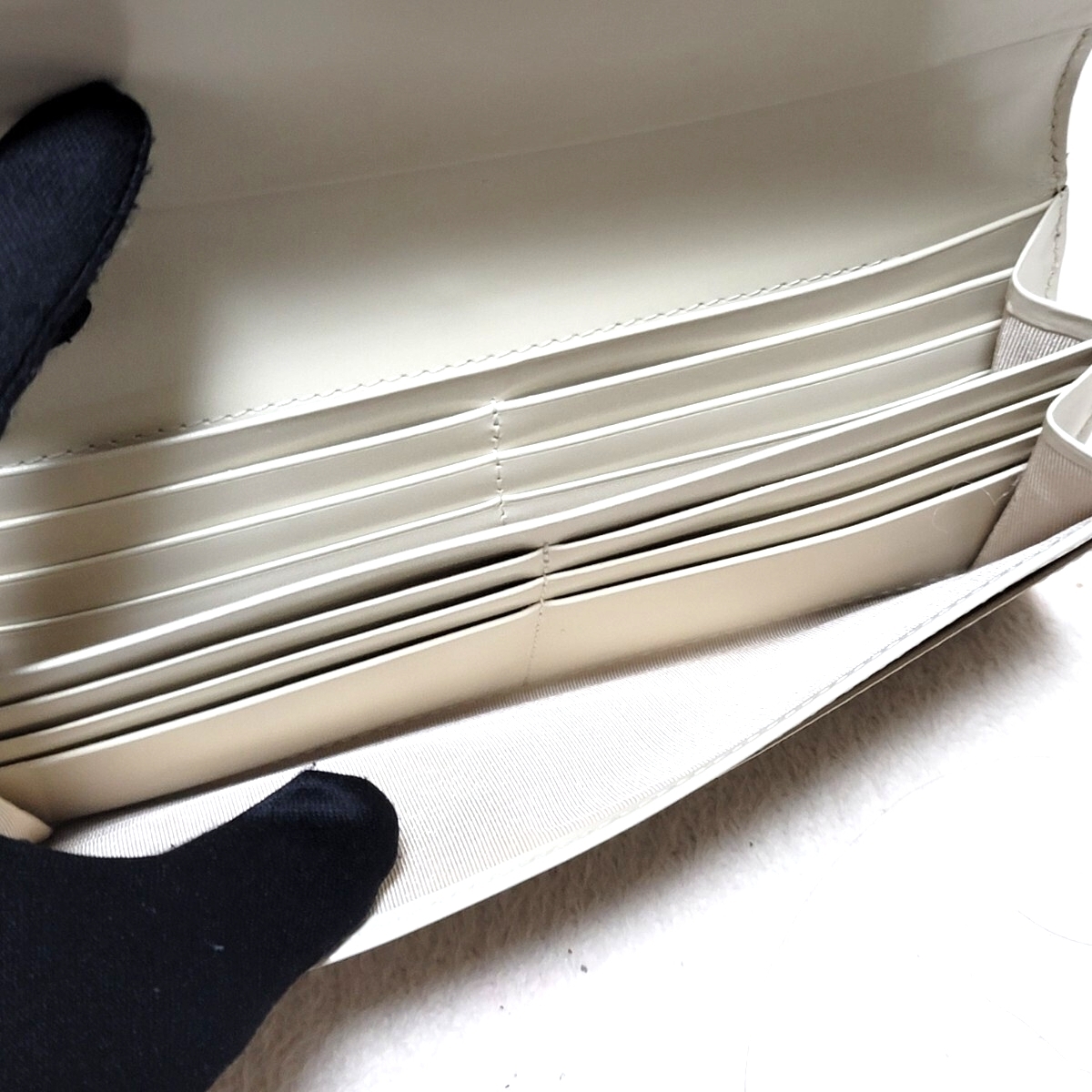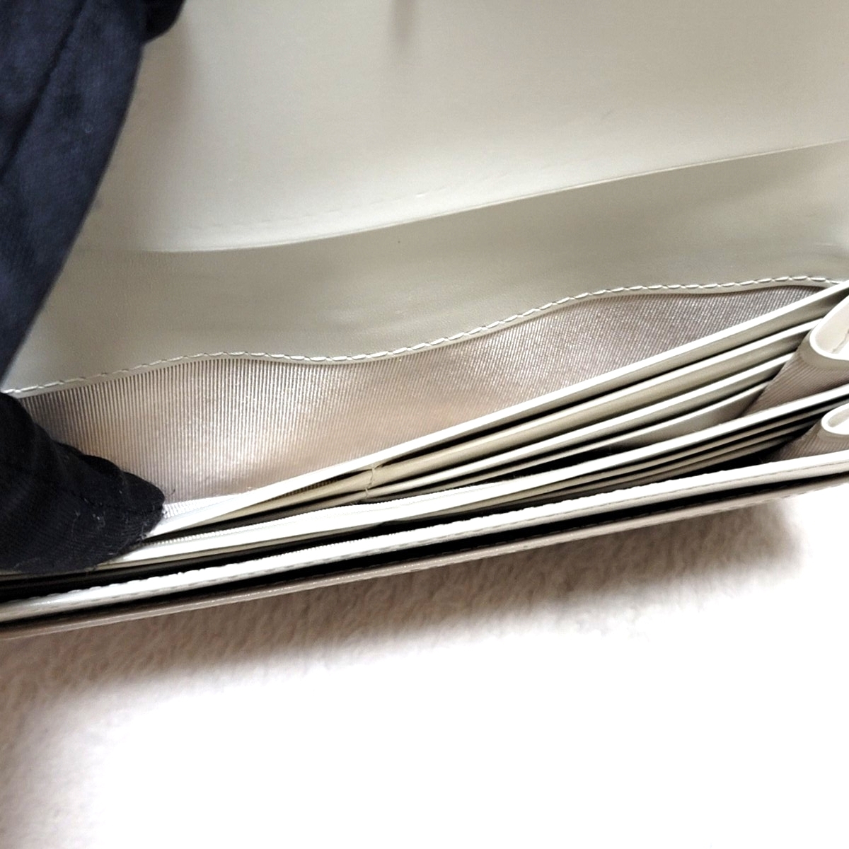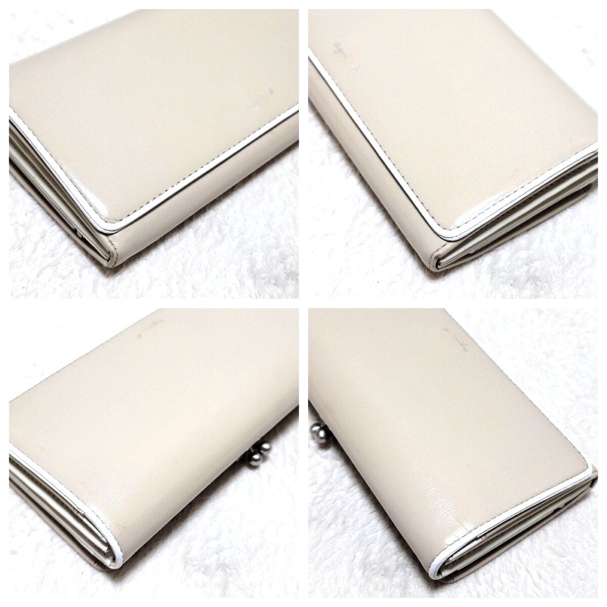 表面色の表現が難しいですがベージュ系にあたるかと思います。内装はホワイトです。札入れ、カード入れ、小銭入れと揃っておりかなり大容量のお財布です。なんだかんだカード類をたくさん入れたい方に特にオススメです。ガマ口の小銭入れも内部が二ヶ所にわかれておりますので小銭管理にも役立ちます。