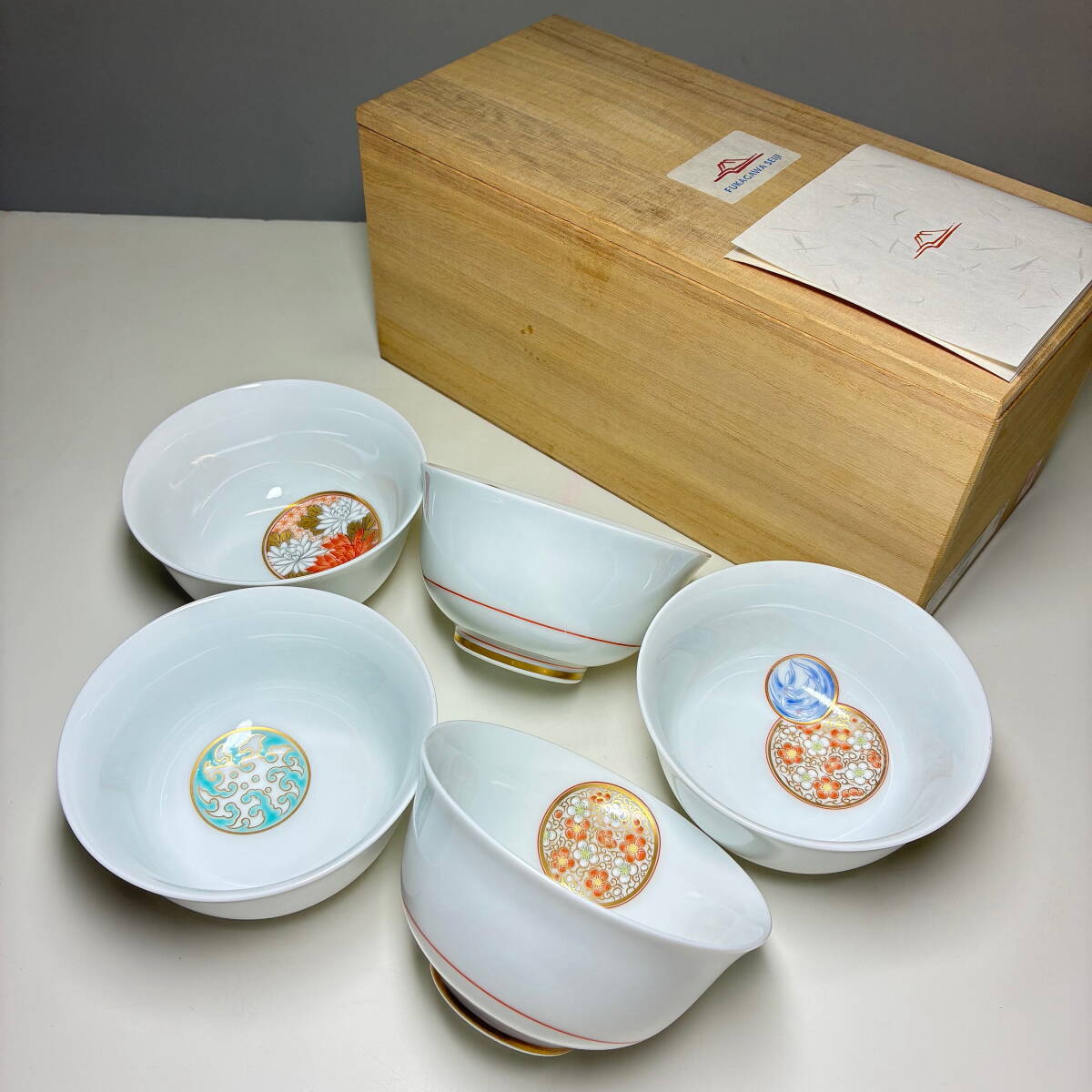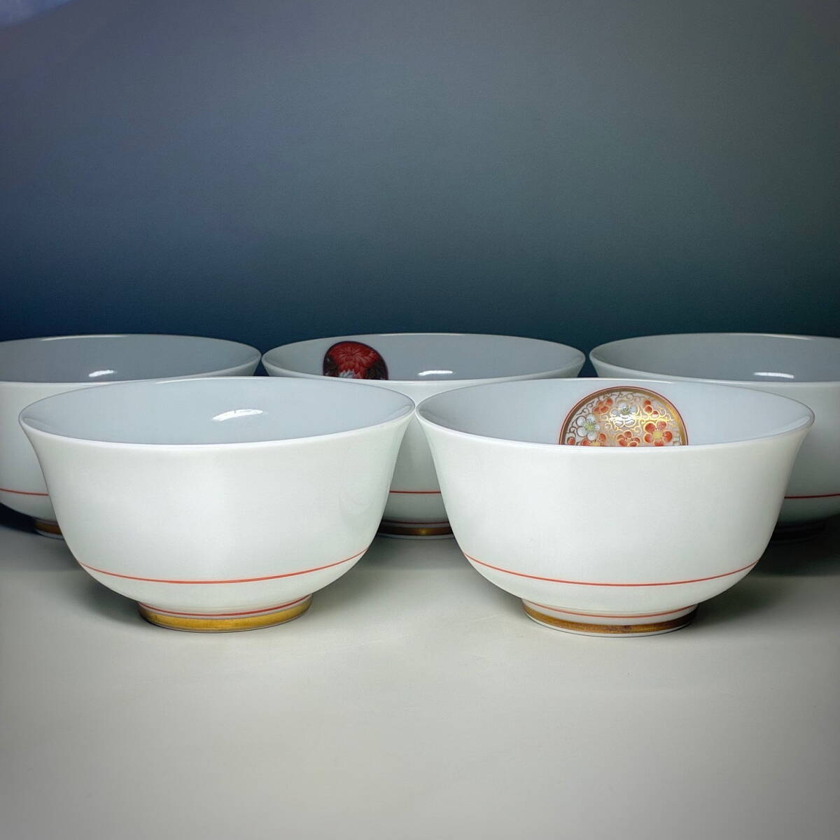 ★深川製磁★赤絵 丸紋 仙茶碗揃い 五客組 口径9.3×高5cm 縁起物★和食器/湯呑み/煎茶器/日本茶