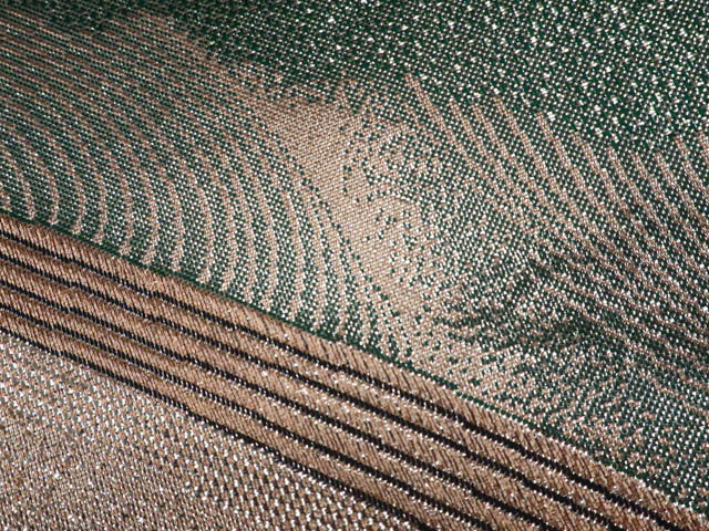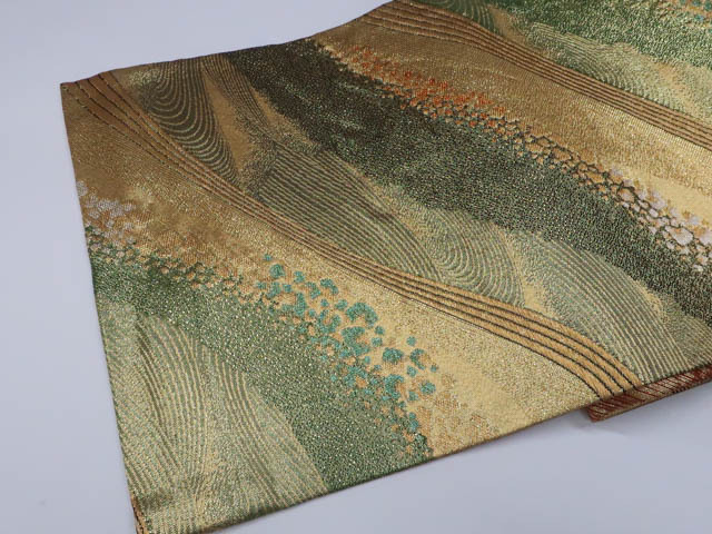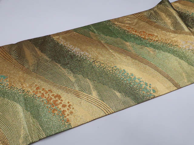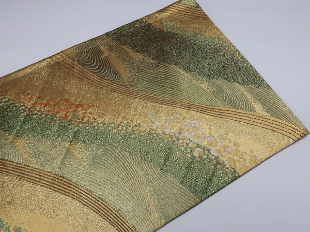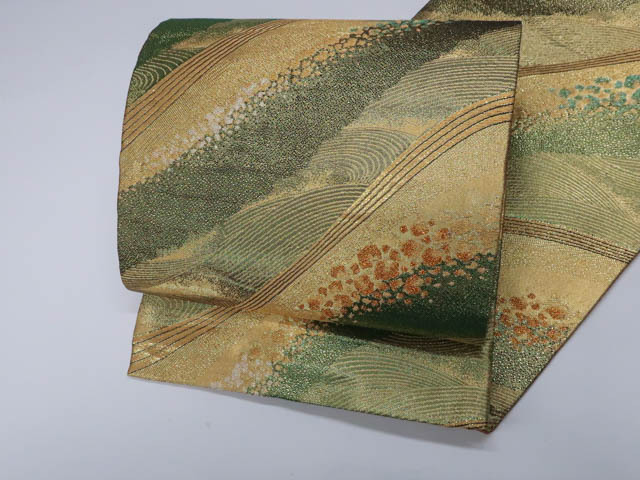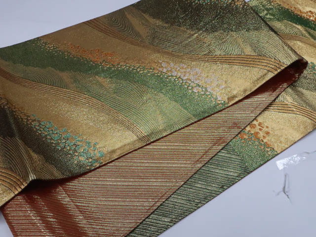 リサイクル商品の為、折山にスレがございますがご着用いただけると存じます。 地色は金です。 1枚目の画像が近いお色かと思われます。 素材は正絹です。 |