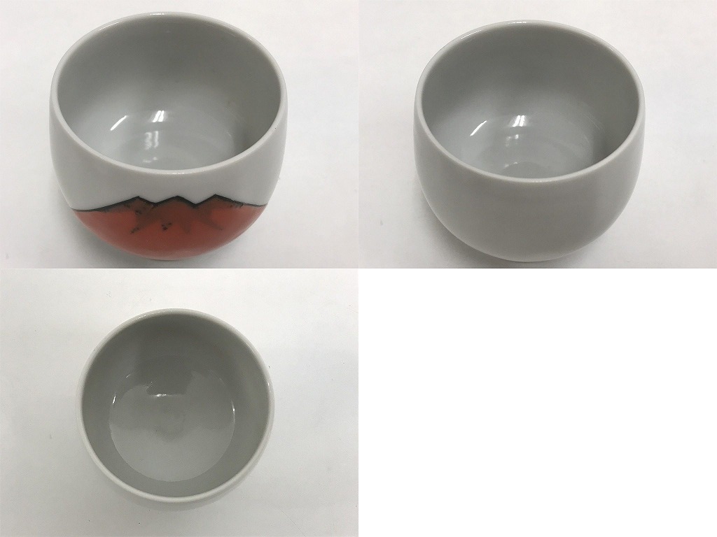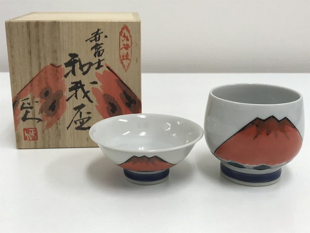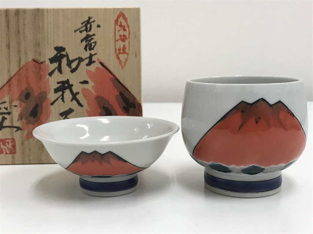 商品説明九谷焼 疲れを癒す晩酌タイム 極上のおもてなし 最高のくつろぎ時間 酒のうつわ 赤富士 平盃・並盃 酒器 でございます。  形違いの盃ペアセットです。 平型でのんだり、丸型でのんだり、気分によって使い分けることが出来るので、疲れを癒す晩酌タイムにうってつけ。