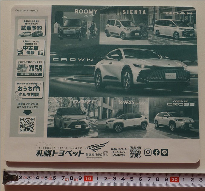 | 商品説明 | 札幌トヨペット マウスパッド&メモ マウスパッドの下がメモ帳になっています。 マウスパッド部分は紙製 メモは20枚 サイズ 23×19㎝ 多少の誤差はお許しください。 家庭での保管品です。 気になる方は、入札ご遠慮ください。 整理番号 23383 |