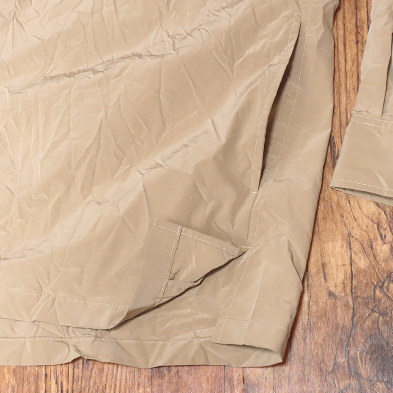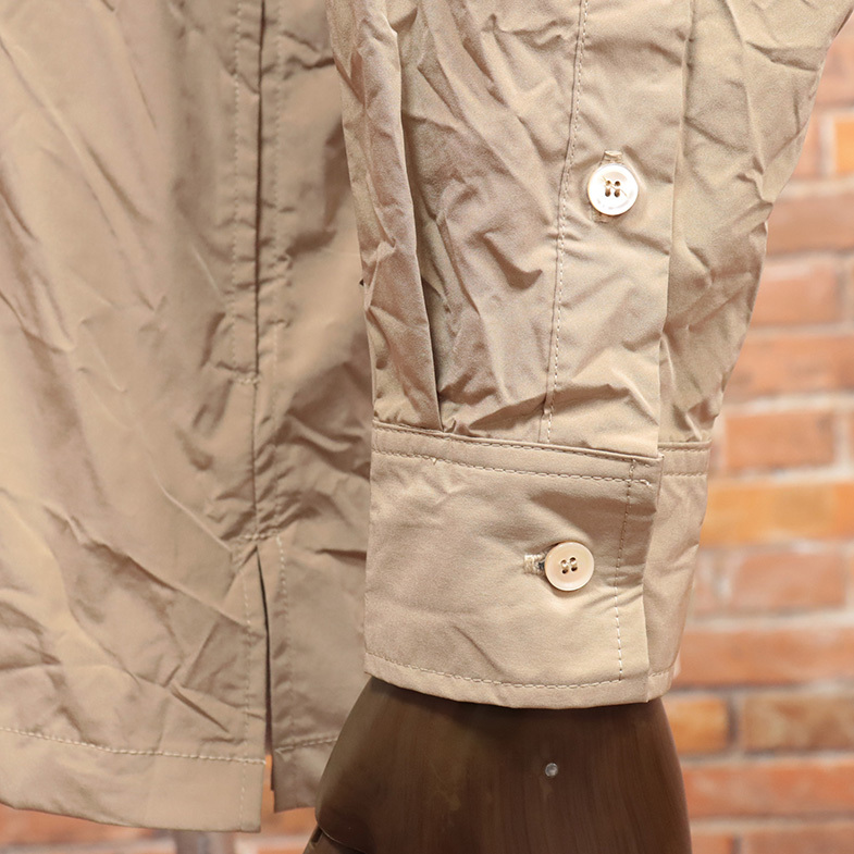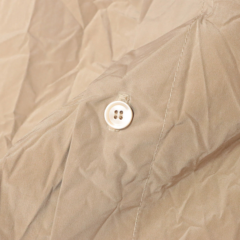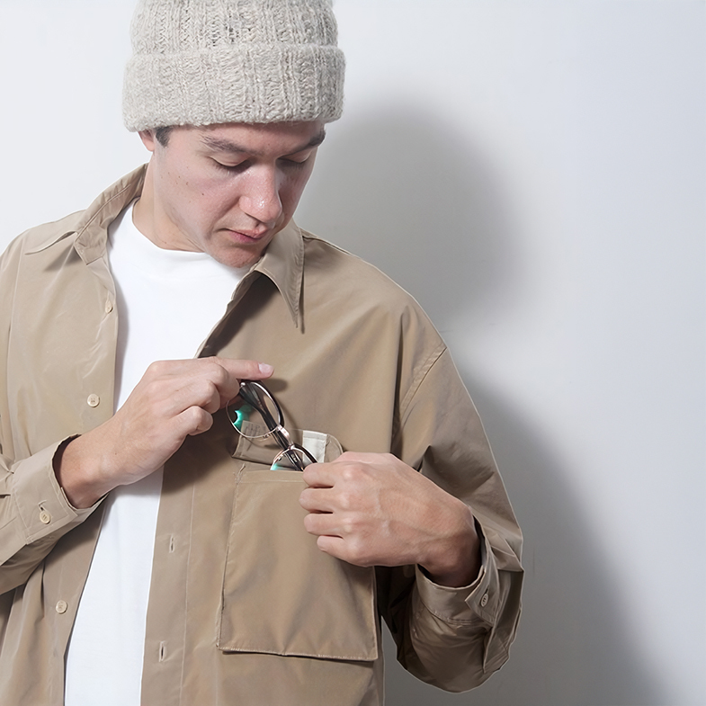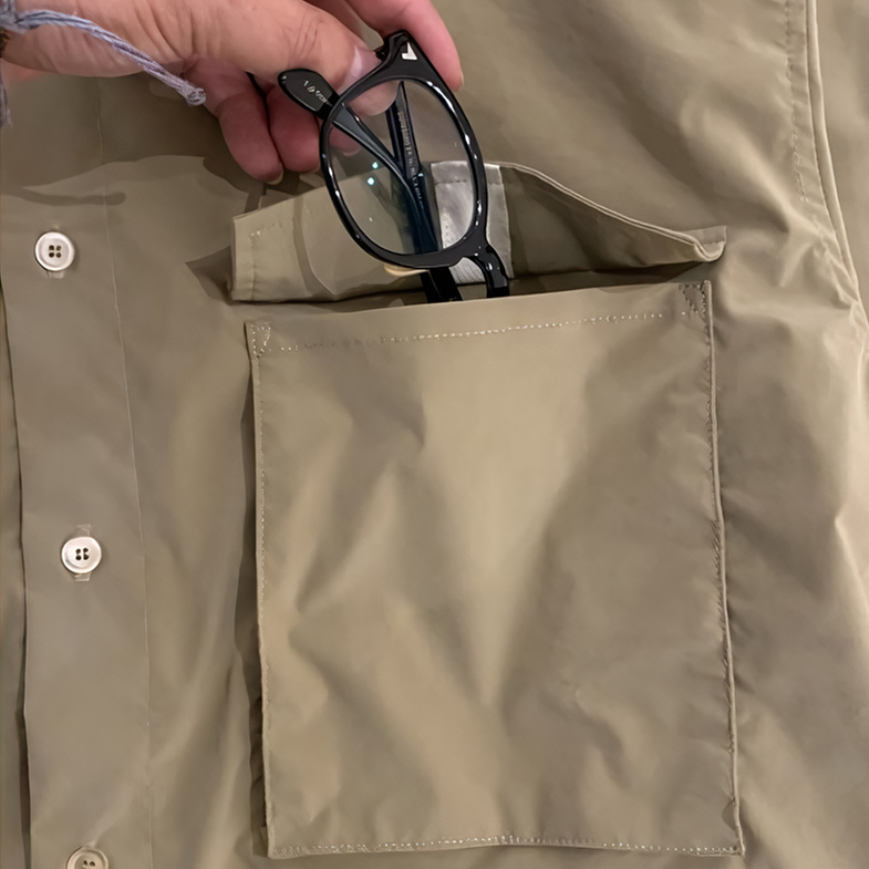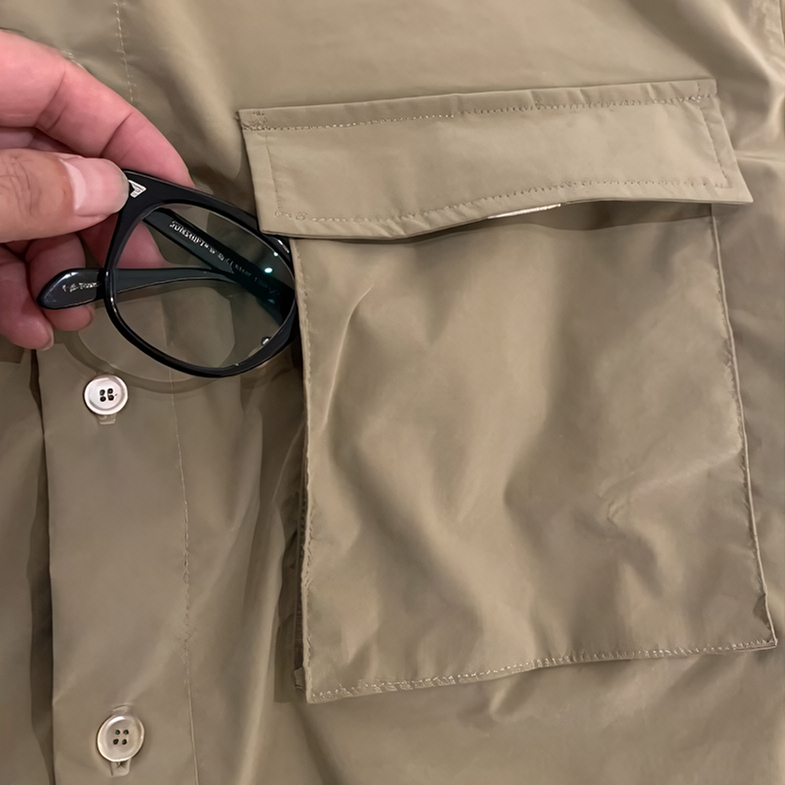 眼鏡拭きに使われる割繊糸にストレッチ性を持たせた貴重なオリジナル素材を、ワッシャー加工で表情豊かに仕上げたシャツ。非常に高密度でピーチスキンのような上品な表情があり、透湿・防水性にも優れています。胸ポケットは二重構造になったダブルポケット仕様で、メガネと他の小物を別々に収納できる便利な作り。胸ポケットの内側と前立ての裏側にはEt baasロゴモノグラムのメガネ拭き生地をあしらい、メガネやスマートフォンの汚れをサッと落とせるユニークなデザインとなっています。シルエットは、程よいゆとりを持たせながらもすっきりと見えるよう計算されたボックスシルエット。トップスとしてはもちろんライトアウターとしても使えるデザインなので、幅広いコーディネートに活躍してくれます。