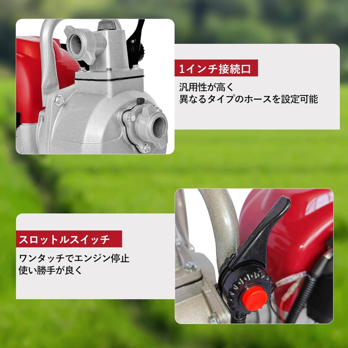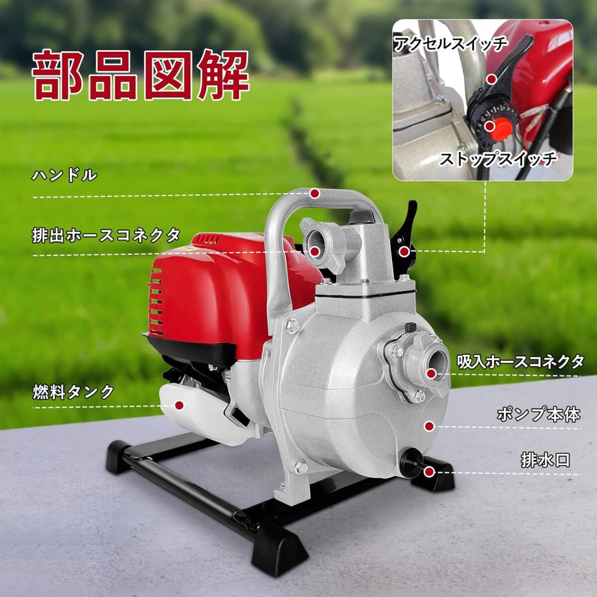 【省エネと低燃費】:エンジンポンプ電気不要のガソリン駆動水ポンプはエネルギー効率が良く、燃料消費を抑える設計が施されています。運転中の騒音が少なく、環境への負担が少ないです。