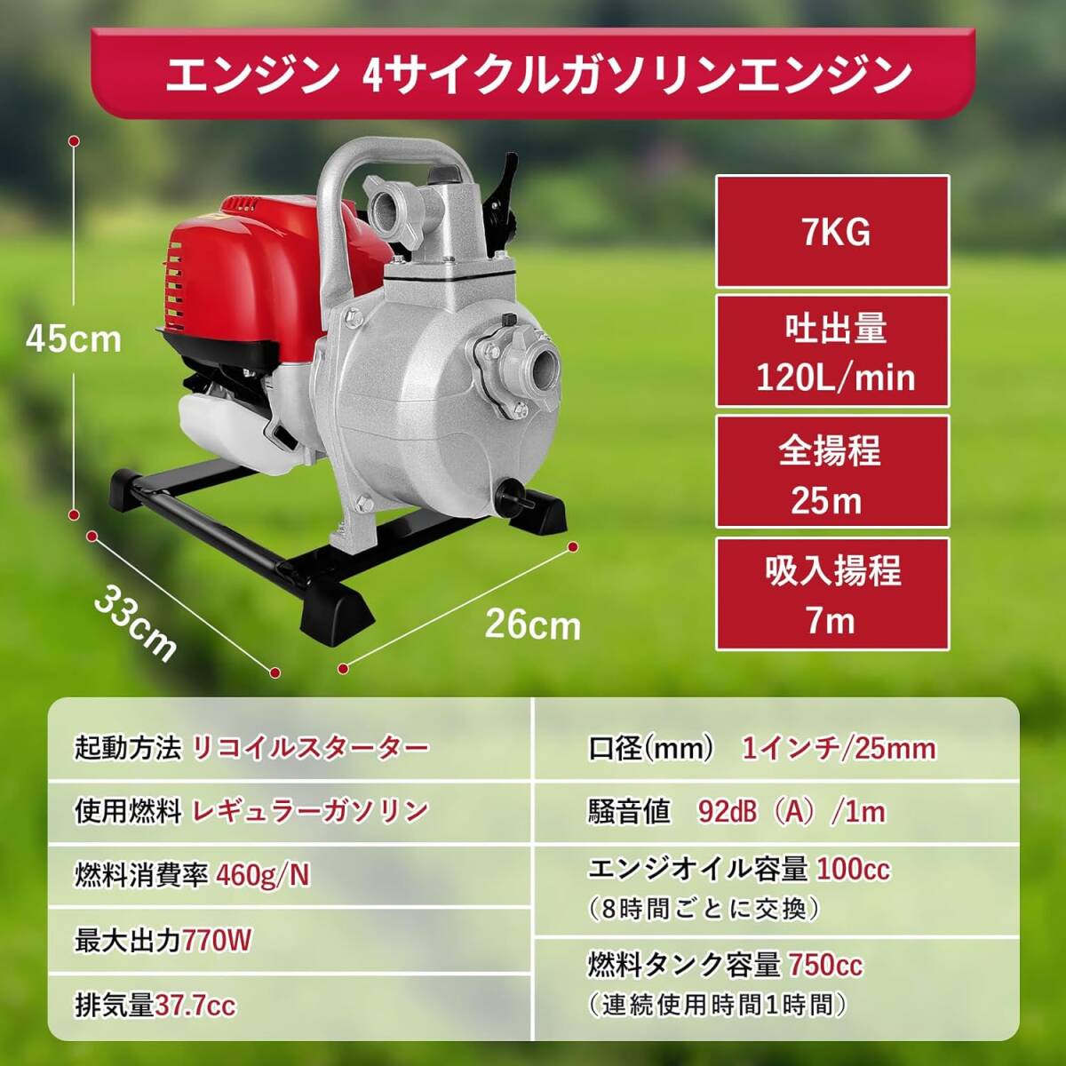 エンジンポンプ 給水・排水ポンプ エンジン式排水ポンプ 4サイクル 1インチ(25mm)給水ポンプ 小型水ポンプ 排気量37.7cc 92