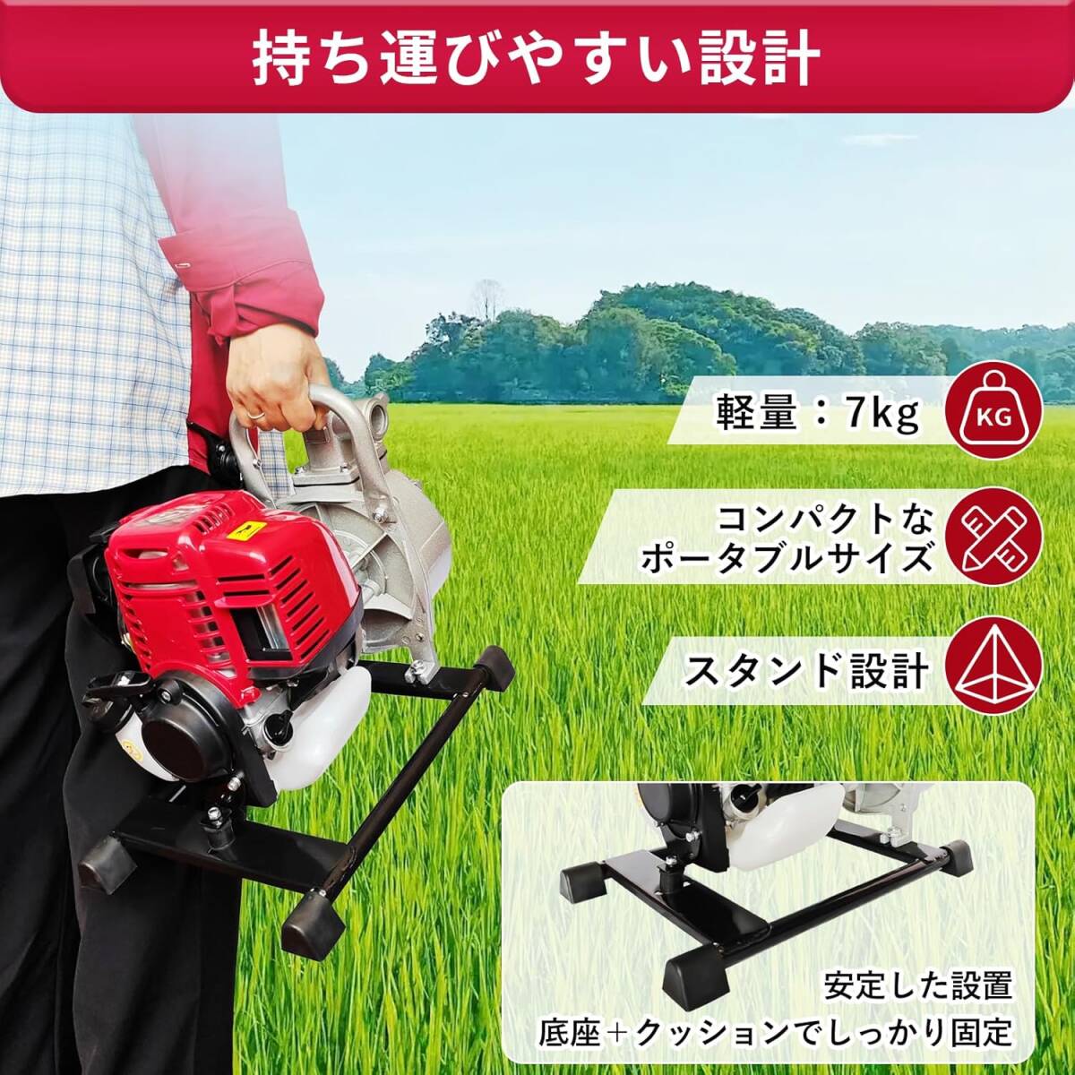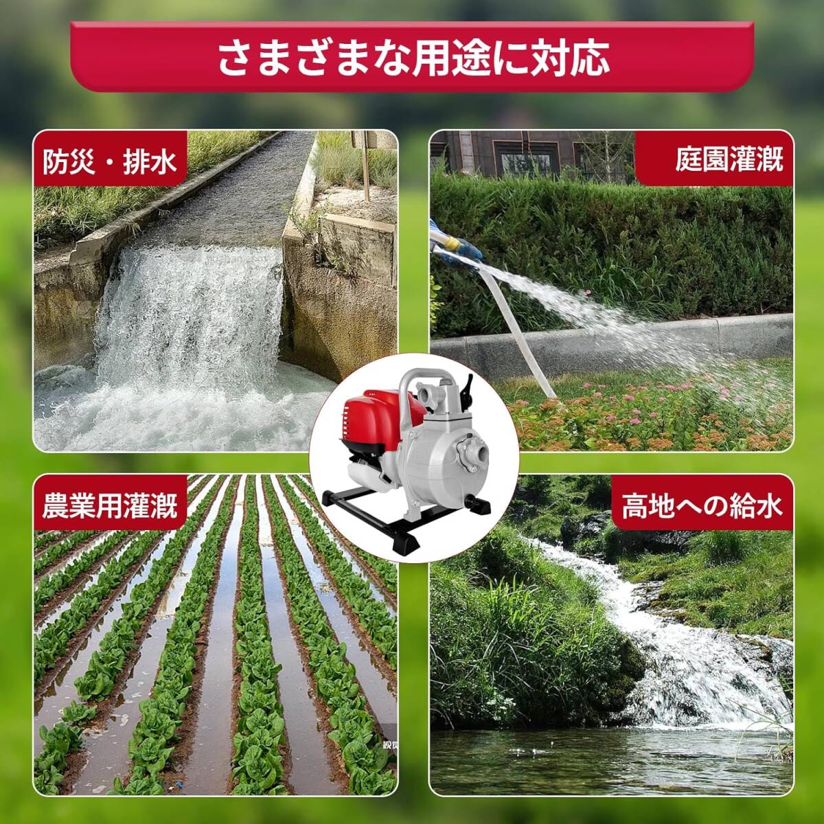【広範囲な使用範囲】:エンジン式ポンプは利用範囲が広く、水道設備のない場所でも活用できます。農地での水汲み、内水氾濫の排水、ビニールハウスでの栽培にも適しており、さまざまな用途に対応可能です。
