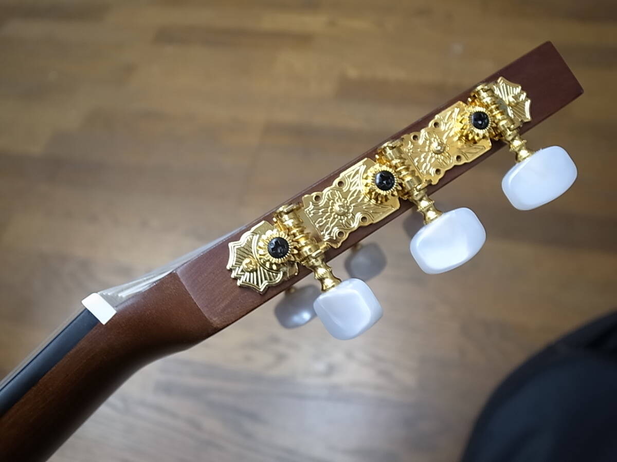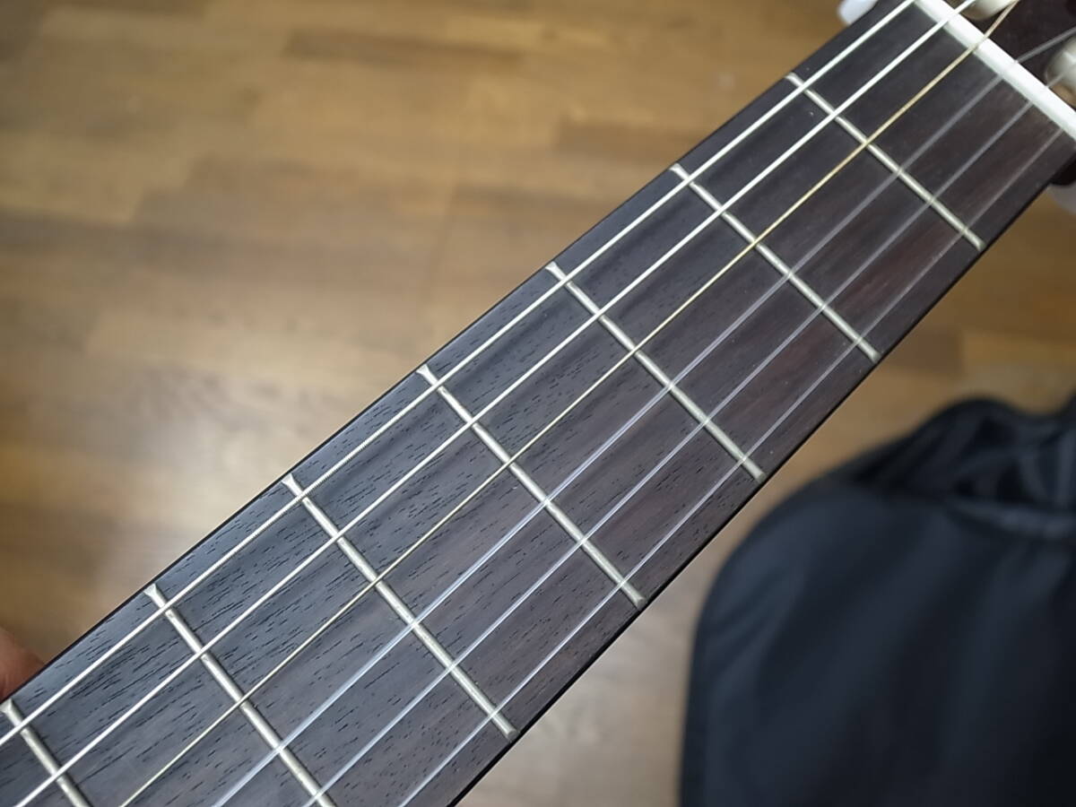 レギュラーチューニングでの12Fの弦高は、1弦3,5mm、6弦4,5mm。サドル余裕は2,5mmです。