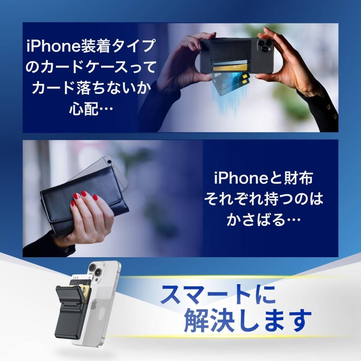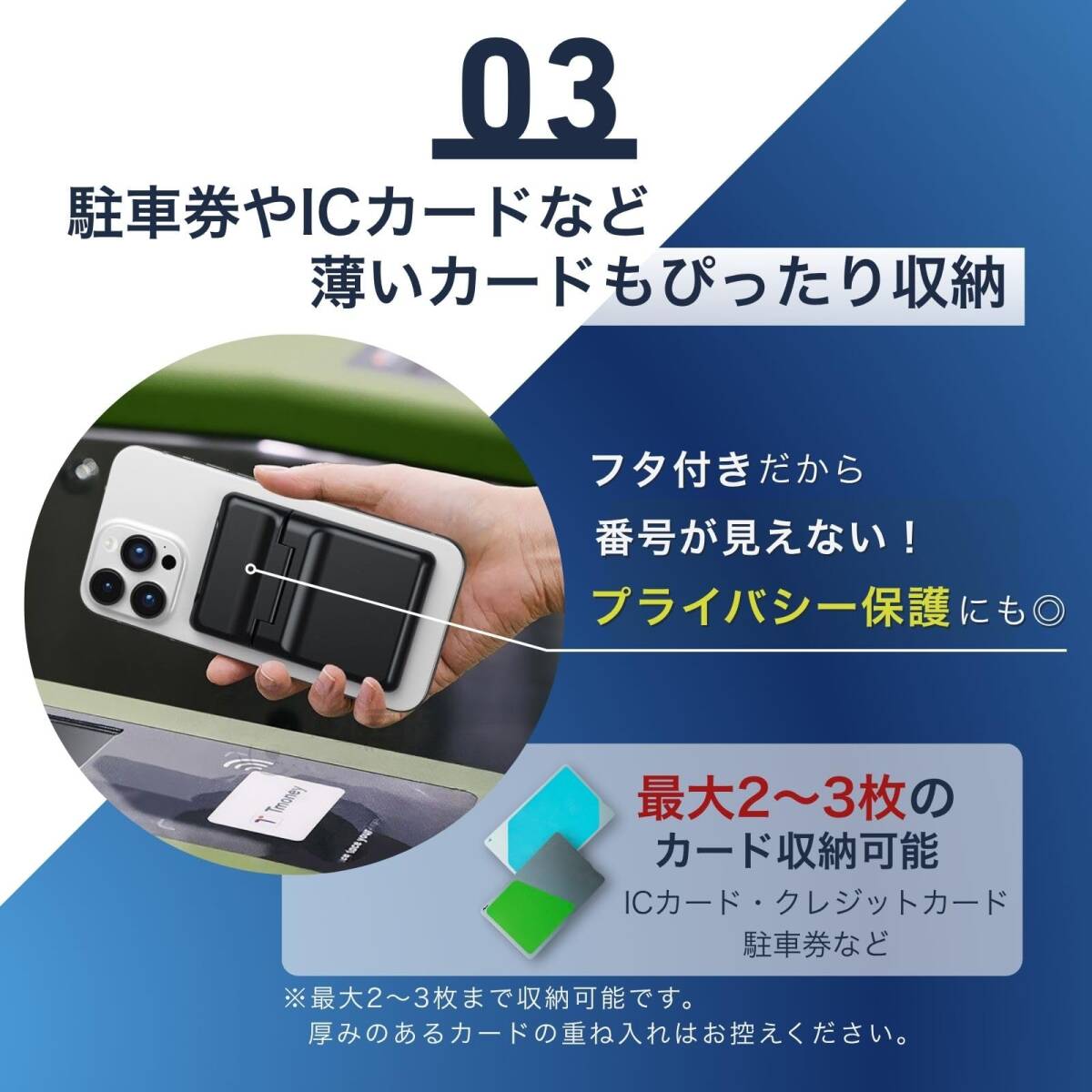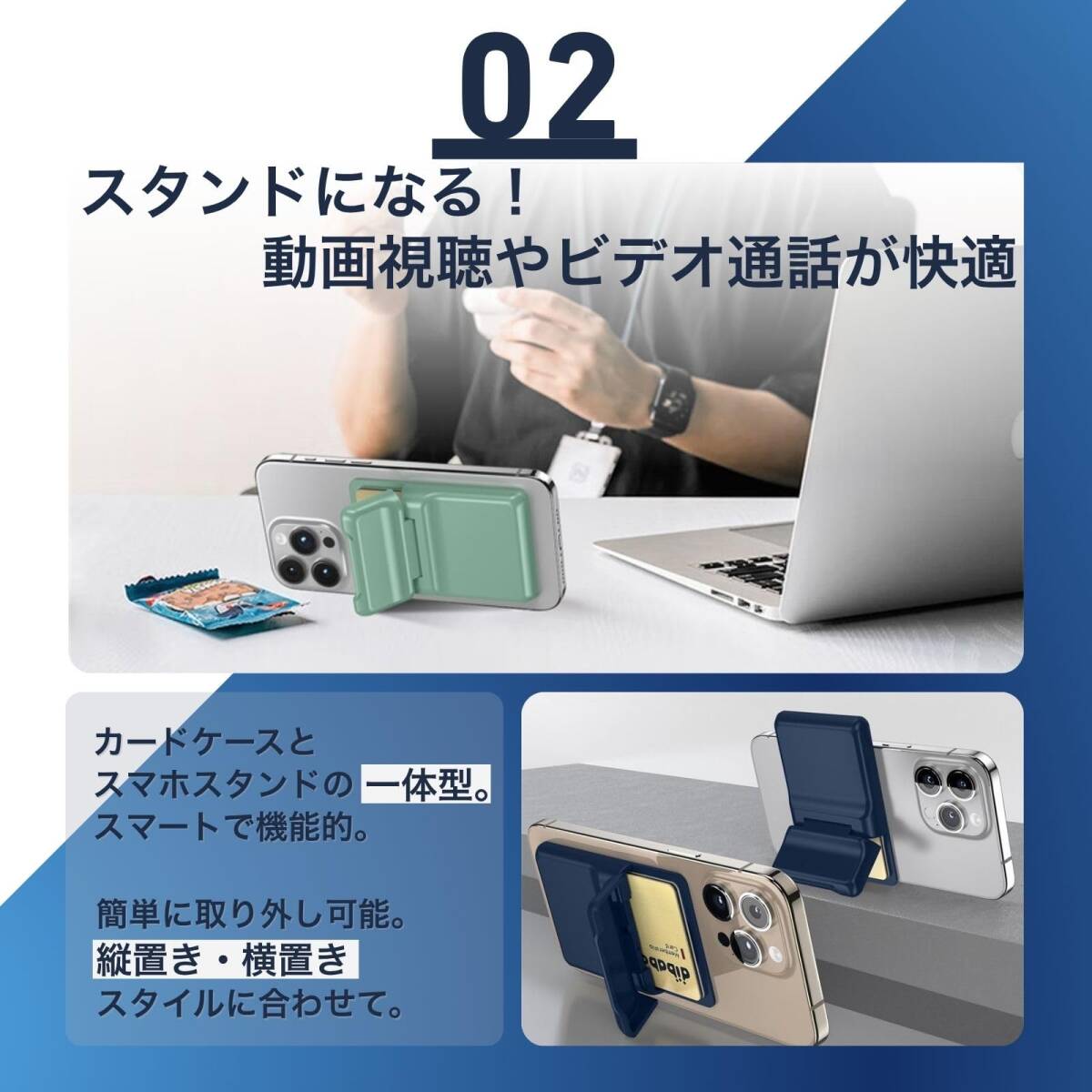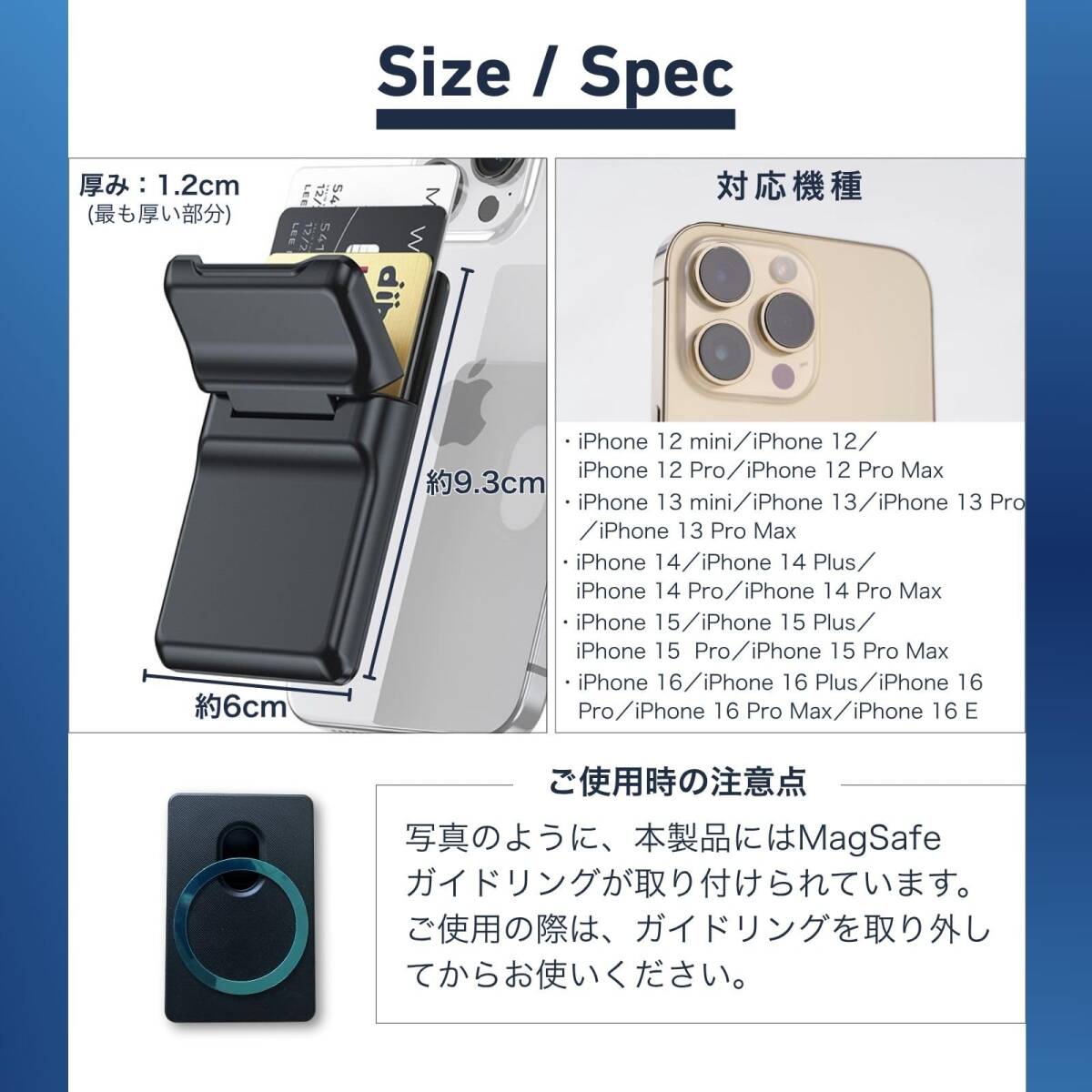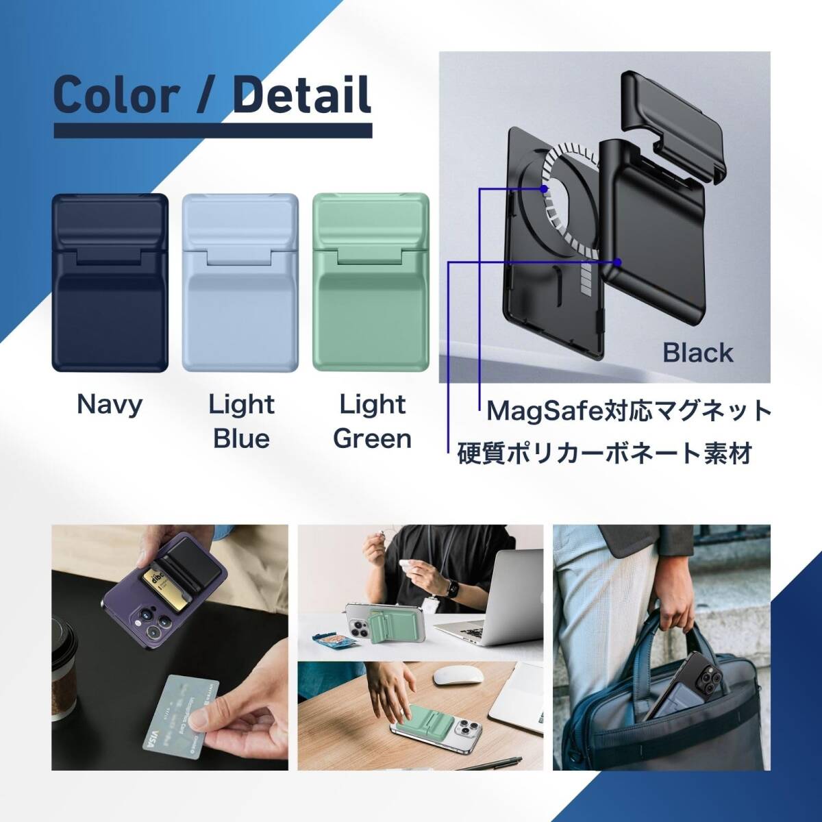 ・MagSafe対応:iPhoneのMagSafe機能にしっかり固定 ・カード収納付き:ICカードや名刺、駐車券の収納に便利 ・スタンド機能:横置きにして動画視聴やビデオ通話に対応 ・フタ付き構造:しっかり閉まる設計でカードの飛び出しや紛失を防止 ・プライバシー保護:外から中身が見えず、安心して持ち歩ける ・ガイドリング付き:初期状態ではMagSafe位置確認用の青いリングが装着されています。使用前に取り外してください。 ・スリムではないが安心感:若干厚みはあるものの、フタ付きでカードの落下リスクが少なく、安心して使えます ・シンプルな4色展開:ブラック、ネイビー、グリーン、水色の4色