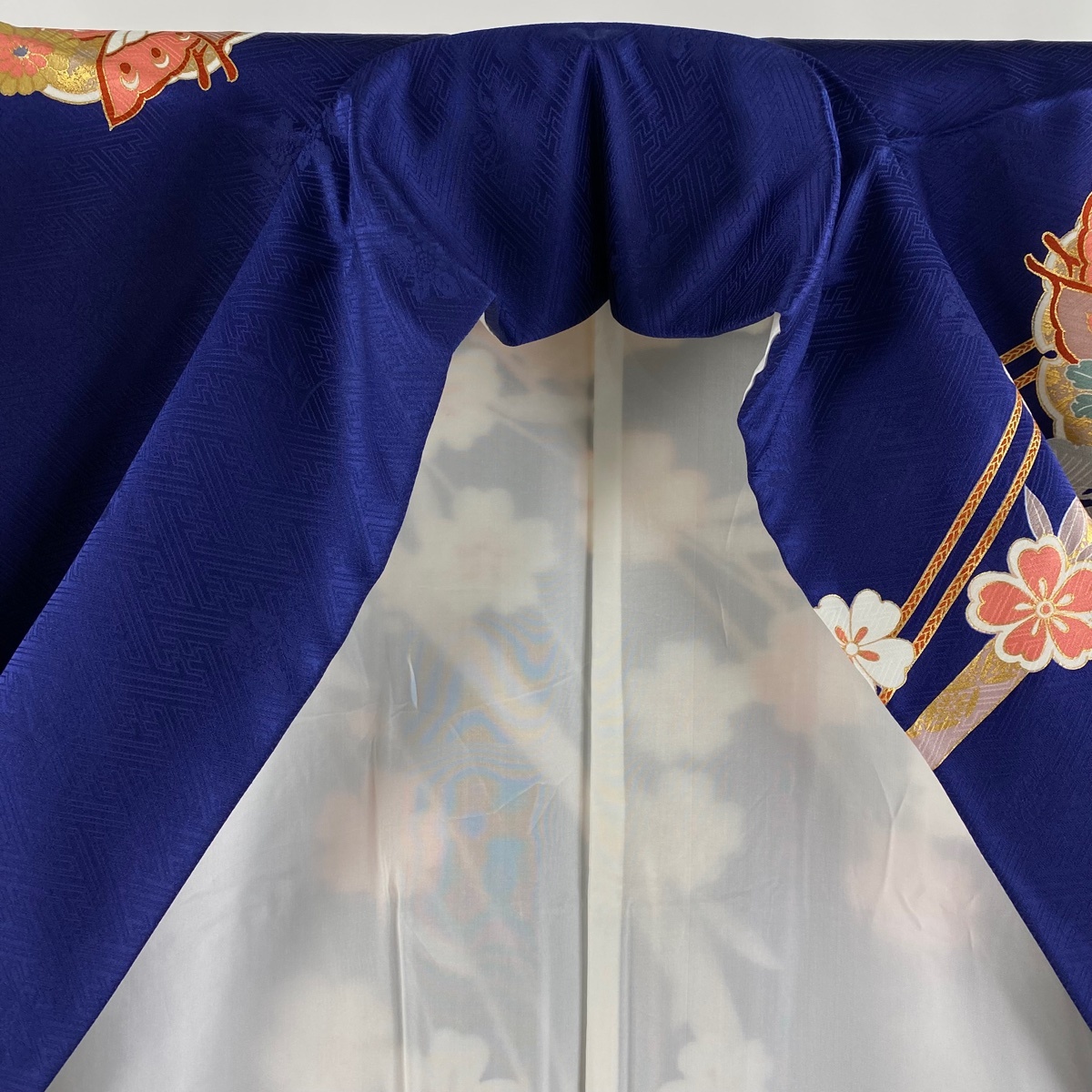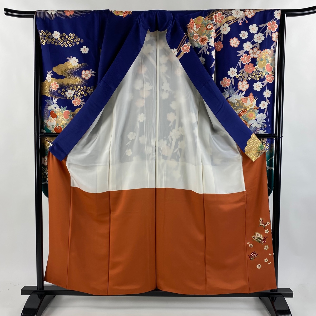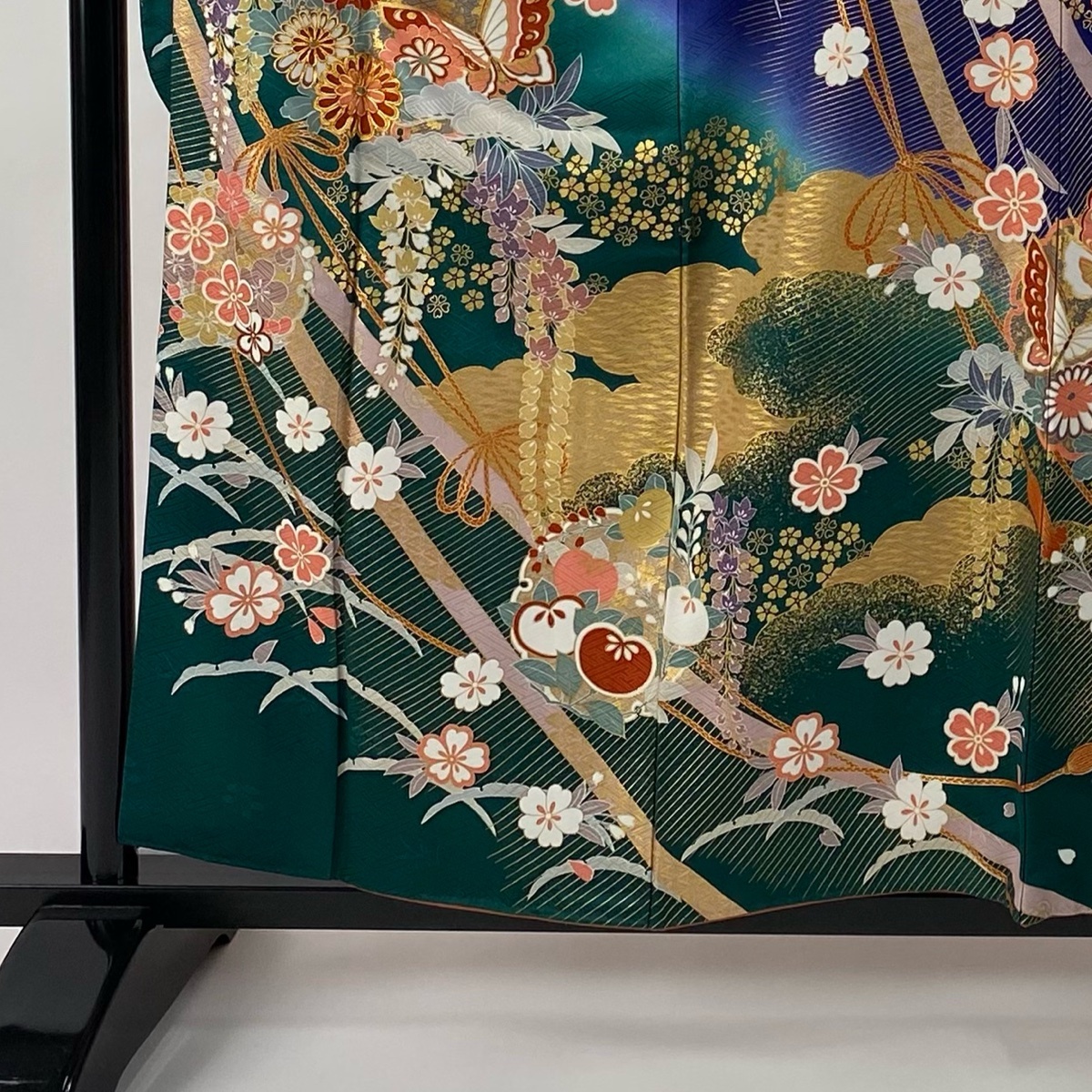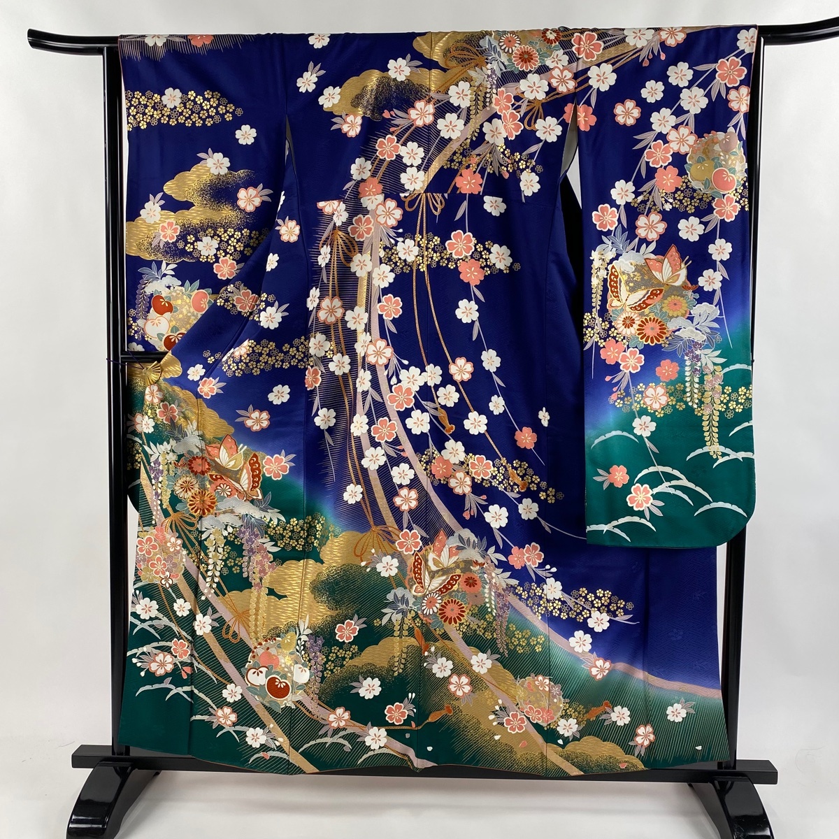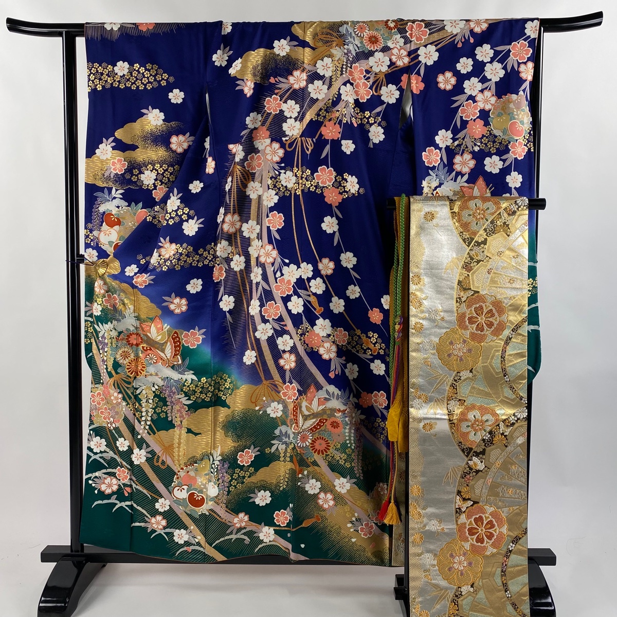 振袖 美品 秀品 袋帯フルセット やまと 蝶 草花 金彩 金糸 青 袷 身丈159 裄丈64.5 M 正絹 【中古】 |