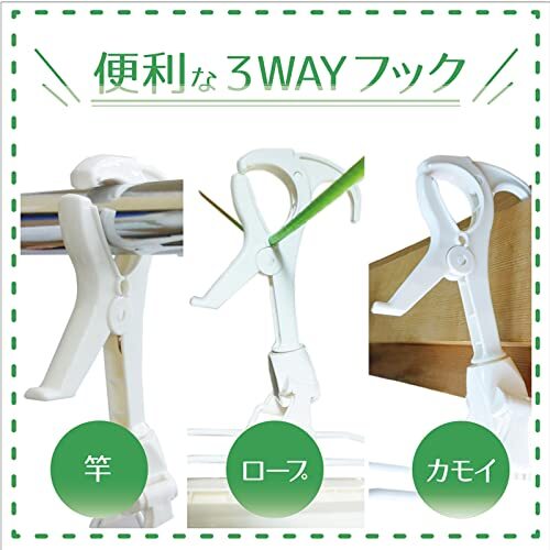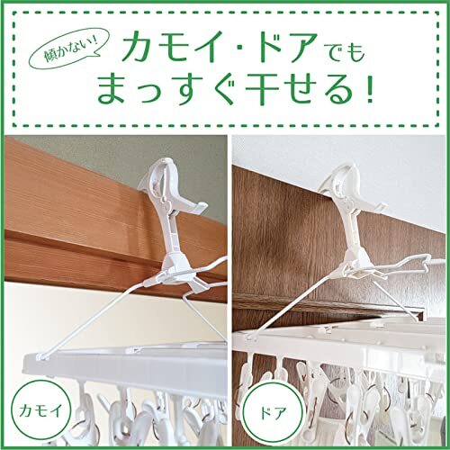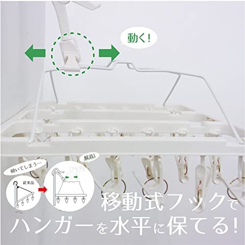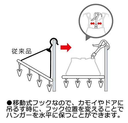 ●コンパクトサイズなので小物干しに便利な洗濯用ハンガーです。 ●移動式フックなので、カモイやドアに吊るす時に、フック位置を変えることでハンガーを水平に保つことができます。 ●フックを移動させる時は、フックの足の部分を片方ずつ持って行なうと簡単に出来ます。 ●ピンチの先端は衣類にやさしい丸型形状。破損したり紛失したピンチは市販のピンチと取り替えることができます。 ●くつ下やハンカチなどの小物干しに便利な24ピンチ ●折りたたんで収納でき、旅行にも便利 【注意事項】 ・本来の用途以外に使用しないでください。 ・ご使用前に製品各部を点検してから使用してください。又、以上が認められる場合はご使用にならないでください。 ・洗濯ばさみやフック及びハンガーの開閉時や洗濯物を取り入れたりする際、手や指を挟まないようご注意ください。 ・フックで固定できる竿は、直径2.5cm~4cm以内もので、それ以外のサイズでは固定できず、落下の可能性もあります。 ・厚み30mm以上のドアなどにはカモイ掛けが使えませんのでご注意してください。 ・下折れタイプの洗濯ハンガーなので、荷重が両端に片寄ると折りたたんでしまったり、荷重が中心にかかりすぎると本体が変形したりする場合があるので、洗濯物を干すときはできるだけ均等になるようバランスよく干してください。 ・カモイにハンガーをかける時、フック位置をワイヤー上で以上して、ワイヤーの端にしっかりとまっていることを確認してから使用してください。 ・カモイ掛け用の位置でフックをご使用の場合洗濯物が多いとたわんだり、落下したりするおそれがあるので、洗濯物が重くなりすぎないよう十分ご注意ください。 ・洗濯物の材質や厚みにより、洗濯物が重くなりすぎないよう十分ご注意ください。 ・洗濯物を直接引っぱって外さないでください。洗濯ばさみや吊りひもや洗濯物が破損することがあります。 ・ハンガーに洗濯物を干したまま取り入れる時、フック部を傾けないようにしてください。フック部を傾けると反動でフックのジョイント部が外れるおそれがあります。 ・屋外の使用に際して、強風時は室内に取り入れてください。 ・長期間直射日光にさらすと紫外線により退色、劣化が進み破損しやすくなってきます。洗濯ばさみがよわくなったと感じられた場合には新しい洗濯ばさみとお取替えください。 ・使用後は室内で保管してください。長期間直射日光にさらすと劣化がすすみ破損しやすくなります。 ・火のそばや高温になる場所には置かないでください。 ・廃棄時は各自治体の定める方法に従って処理してください。