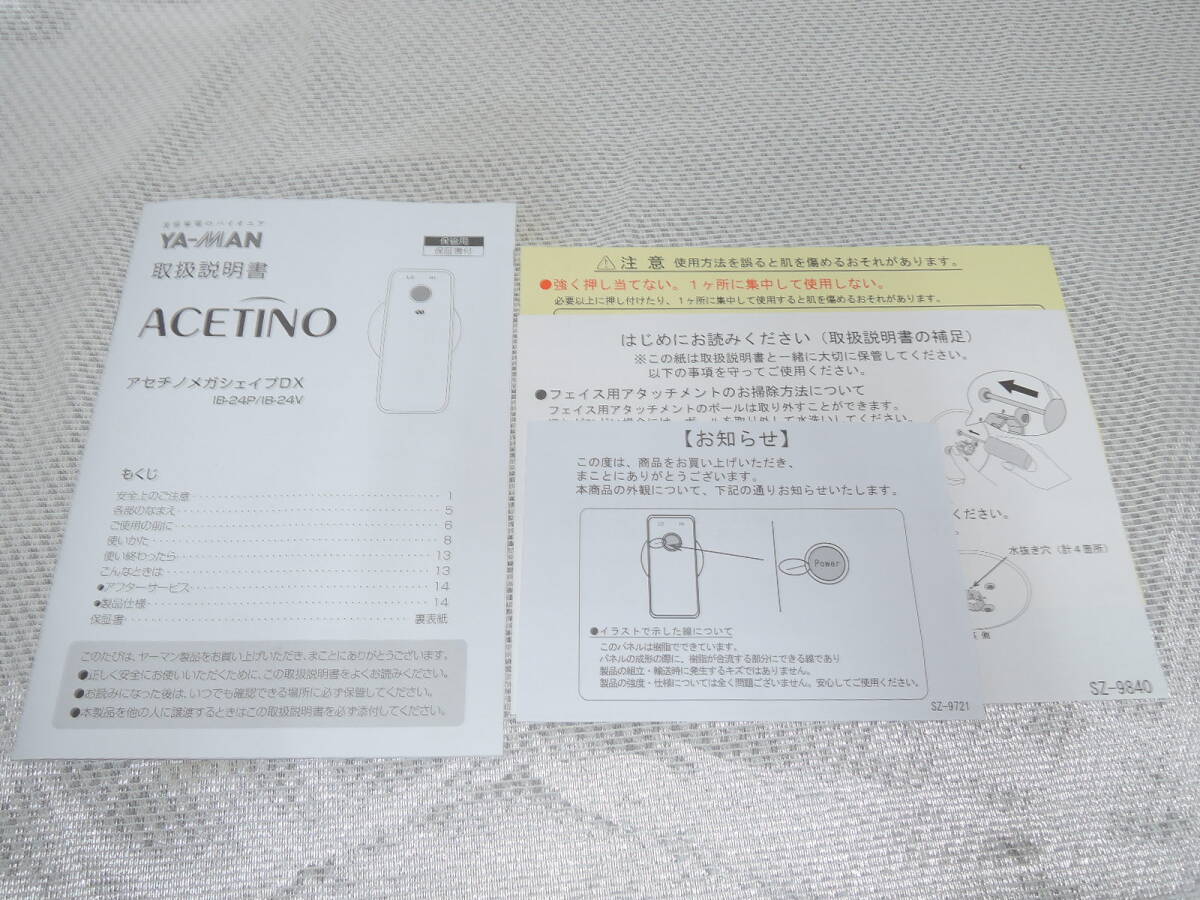 [管理番号:052] YA-MAN ACETINO 美容器 ・アセチノスリムタップ グランデ IB-21 【美品】 ・アセチノメガシェイプDX IB-24V 【未使用品】 まとめ売り 【状態:完動品】 【付属品】 IB-21:本体、ボディ用アタッチメント、ACアダプタ IB-24V:本体、クラッセルアタッチメント、ボディ用アタッチメント、フェイス用アタッチメント、ACアダプタ、取説、元箱 収納バッグ 他にも画像が御座いますので宜しければご覧になってください。 ACETINO IB-21 & IB-24V | ||