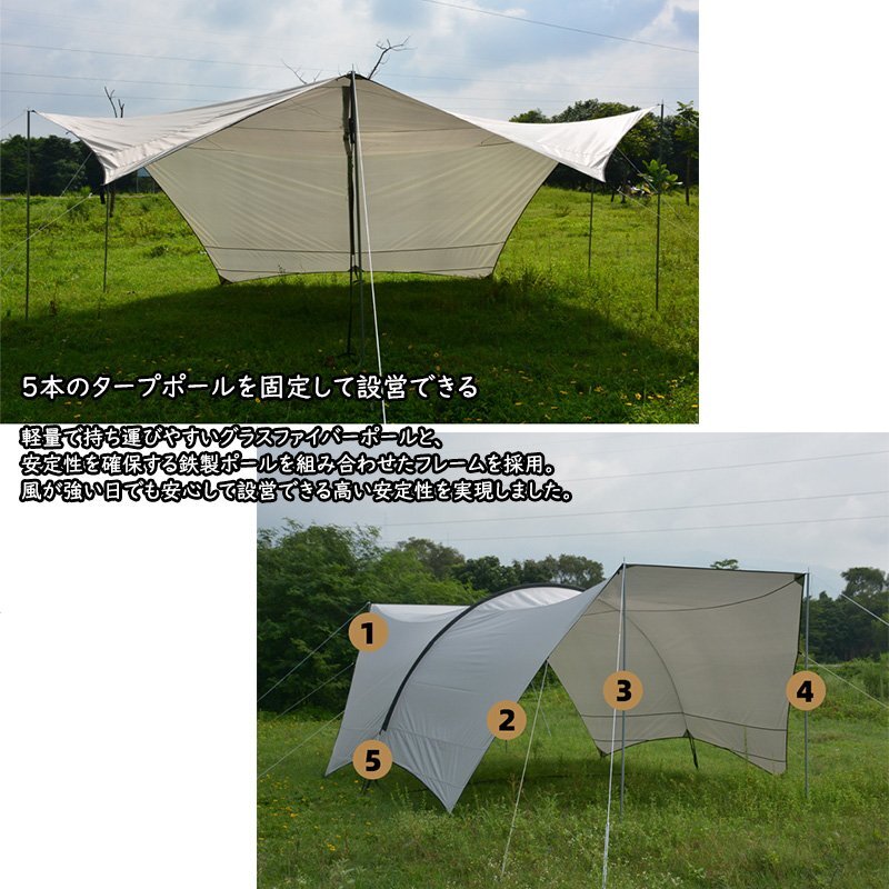 【耐久性抜群の素材と構造】軽量で持ち運びやすいグラスファイバーポールと、安定性を確保する鉄製ポールを組み合わせたフレームを採用。風が強い日でも安心して設営できる高い安定性を実現しました。また、テントの生地には高品質な150Dオックスフォード生地を使用しており、耐摩耗性にも優れています。長く使えるアウトドアギアとして信頼できる一品です。