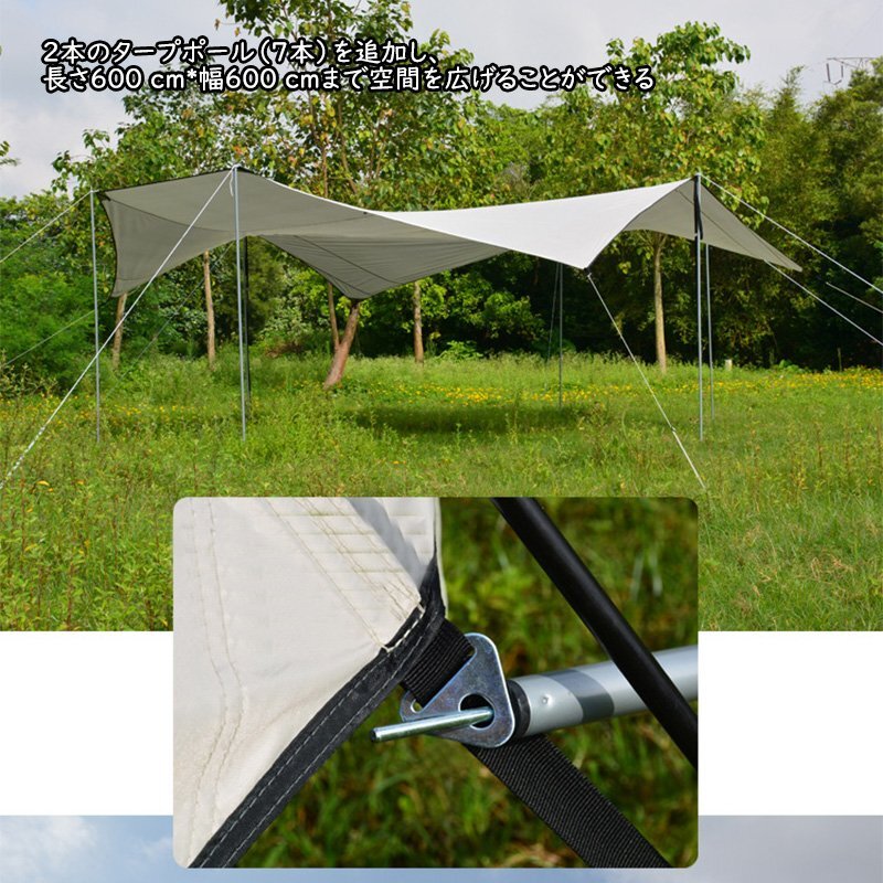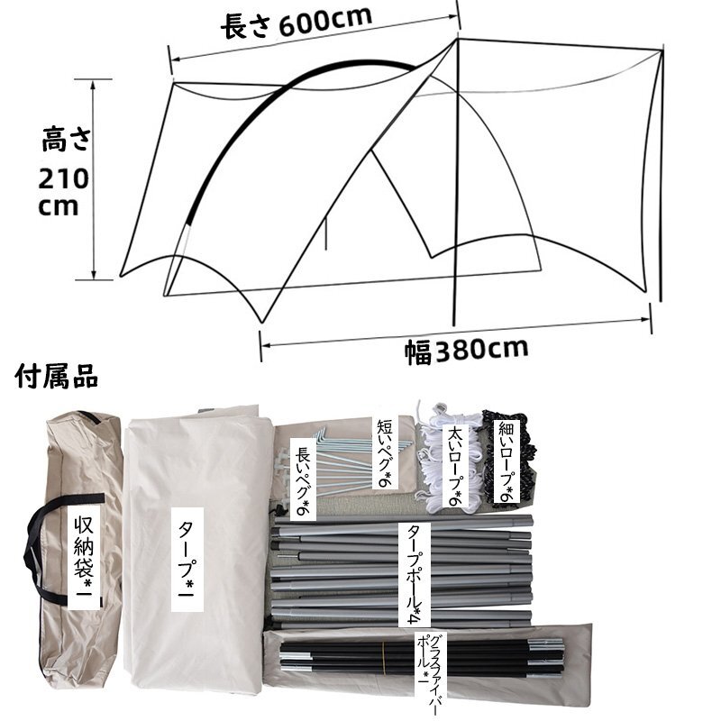 付属品: 収納袋*1、タープ本体*1、ペグ*12、ロープ*12、タープポール*4、グラスファイバーポール*1