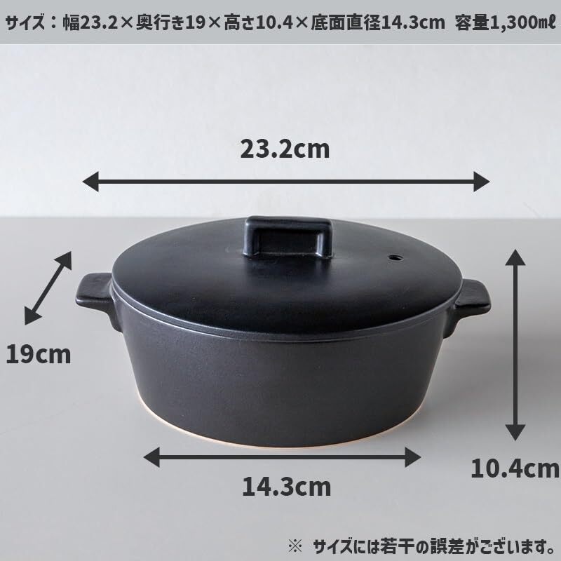 商品説明 | 商品サイズ(:約)直径23.2×奥行19×高さ10.4cm 素材・材質:高耐熱セラミック 原産国:マレーシア 備考:電子レンジ対応・オーブン対応・IH調理器 100V・IH調理器 200V・ガスレンジ対応・ハロゲンヒーター対応 ※食洗機不可※IH200Vの場合、火加減は中火以下でお使いください。※オールメタル対応機種ではご使用になれません。※Siセンサー付き調理器でご使用できない場合は、Siセンサーを解除し充分に注意しながらご使用ください。