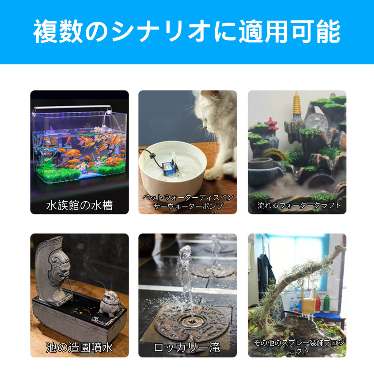 クリーニング方法 | 1.プラグを抜いたポンプに対し、小さくて柔らかいブラシか、水流の下に置くか、破片を浚う 2.水質をキレイに保ち、定期的に水を入れ替え、水が粘り気になって微生物を形成することを防ぐ |