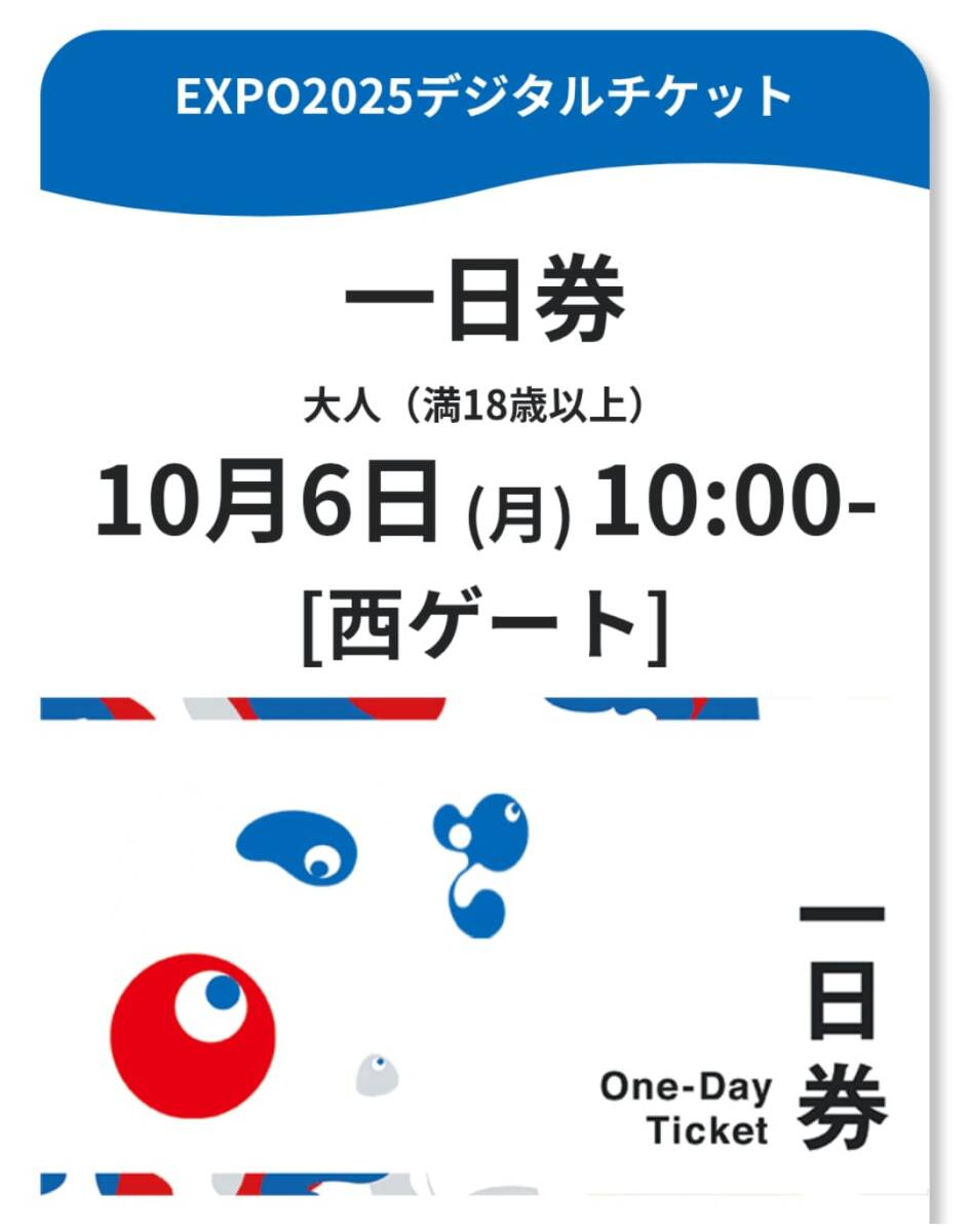 2025大阪・関西万博の10月6日(月)西ゲート10時入場の予約済みチケット(大人一日券)1枚です。