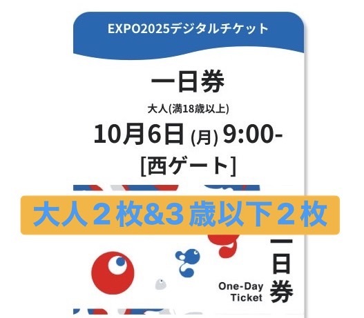 関西万博の入場チケット 大人2枚、3歳以下2枚