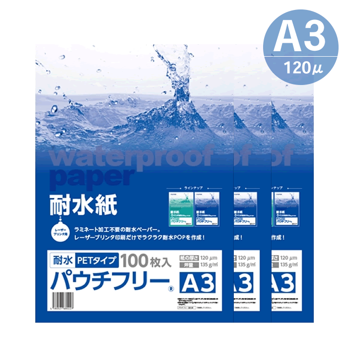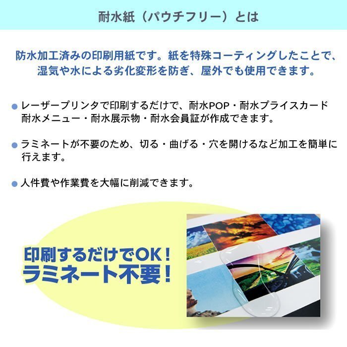 ラミネート不要の耐水紙で業務効率化アップ!! レーザープリンターで印刷するだけで そのまま店舗のメニュー・POP・プライスカード・貼り紙等に活用できます。 |