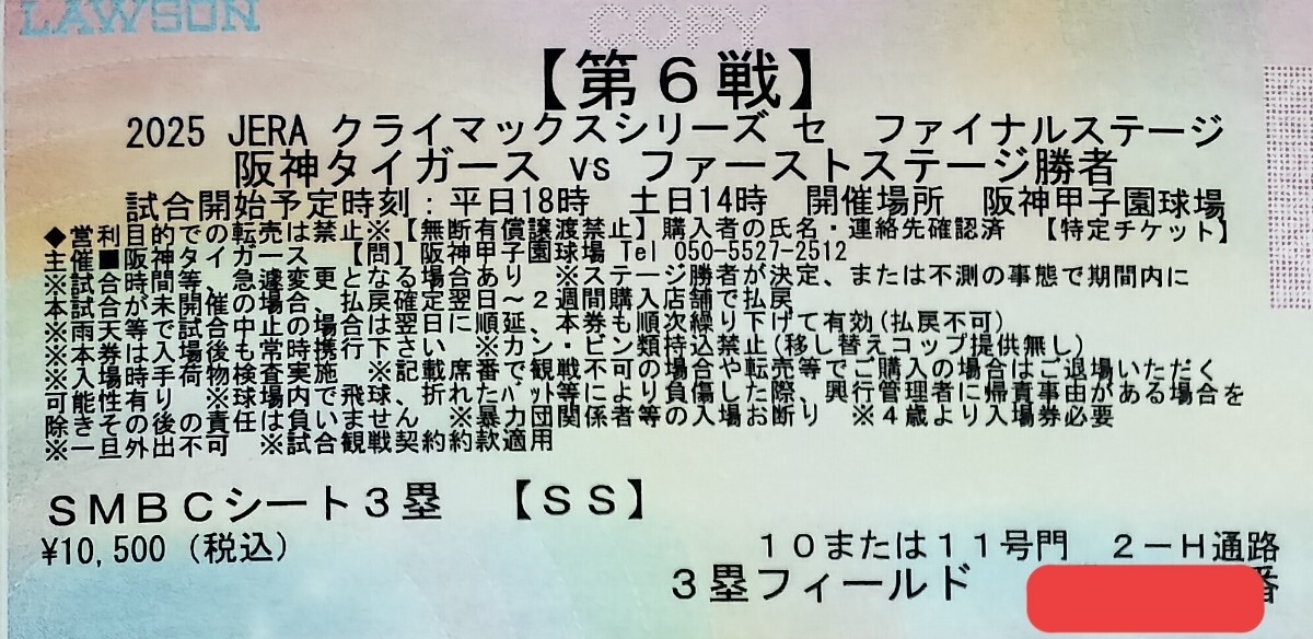 クライマックスシリーズ ファイナルステージ第6戦 阪神タイガース対1stステージ勝者のチケット1枚となります。