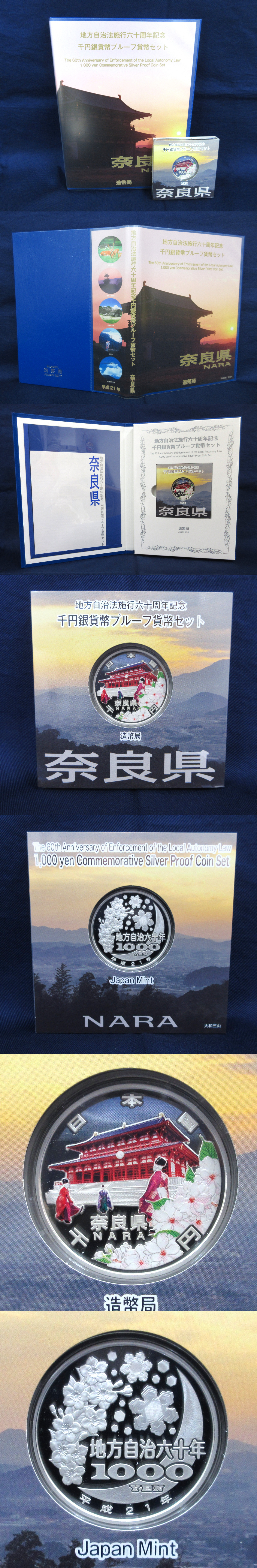 ▼地方自治法施行六十周年記念千円銀貨幣プルーフ貨幣セット【奈良県】▼yz22 ◎独立行政法人 造幣局製造 ◎平成21年(2009)発行の千円銀貨幣が1枚のセットになります。 (デザイン)表面)大極殿正殿(だいごくでんせいでん)と桜と蹴鞠(けまり) 裏面)雪月花(各貨幣共通)