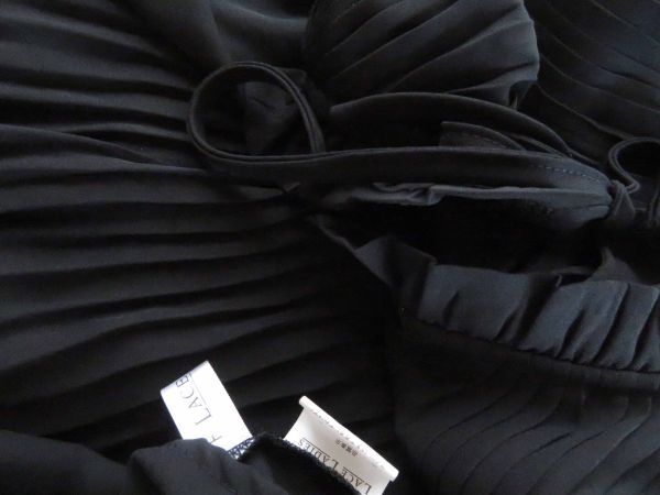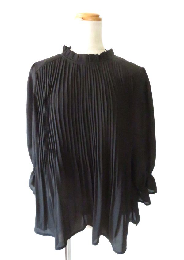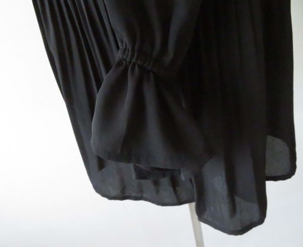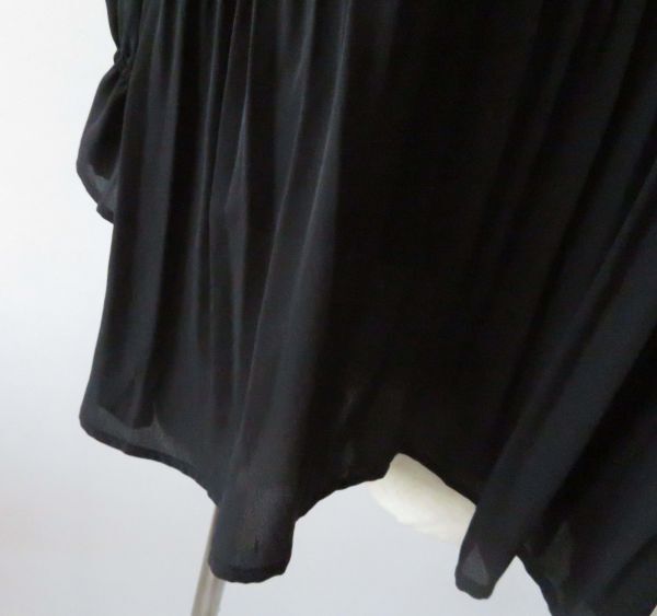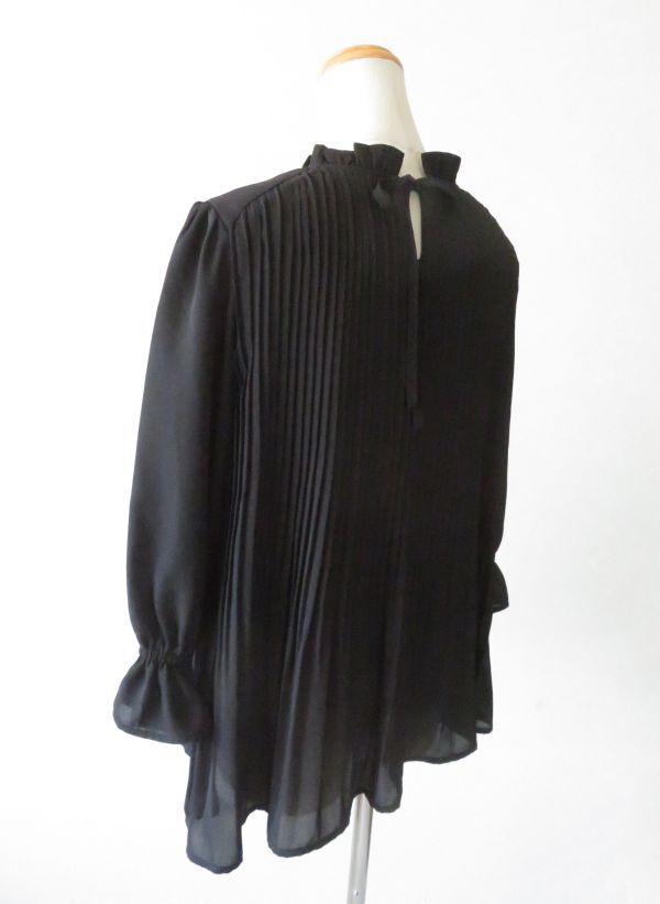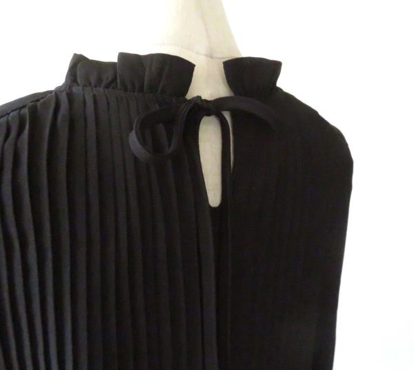 詳細 | 中手の織り地です。気持ちのいい肌触りのさらりとした上質感が素敵な黒の地です。プラスプリーツ加工の地を使って裾へナチュラルな広がりを作ってフリルラインなどで可愛さをおしゃれに入れて丁寧に仕上げてあるトップです 。 状態は綺麗なものです。 |