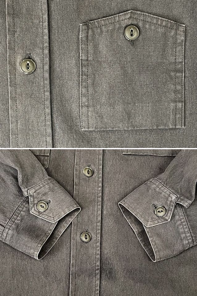 | 説明 | Kingswoodのワークーシャツ ガチャポケやマチなどオールドのディティールです チャコールグレーカラーのフェードがいい雰囲気です スタンドカラーで身幅広く厚手のコットン地でジャケット感覚で合わせられます |