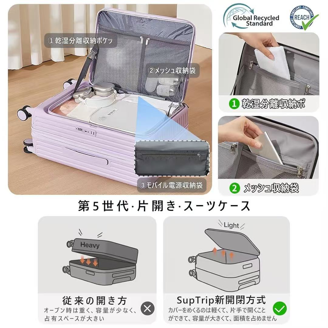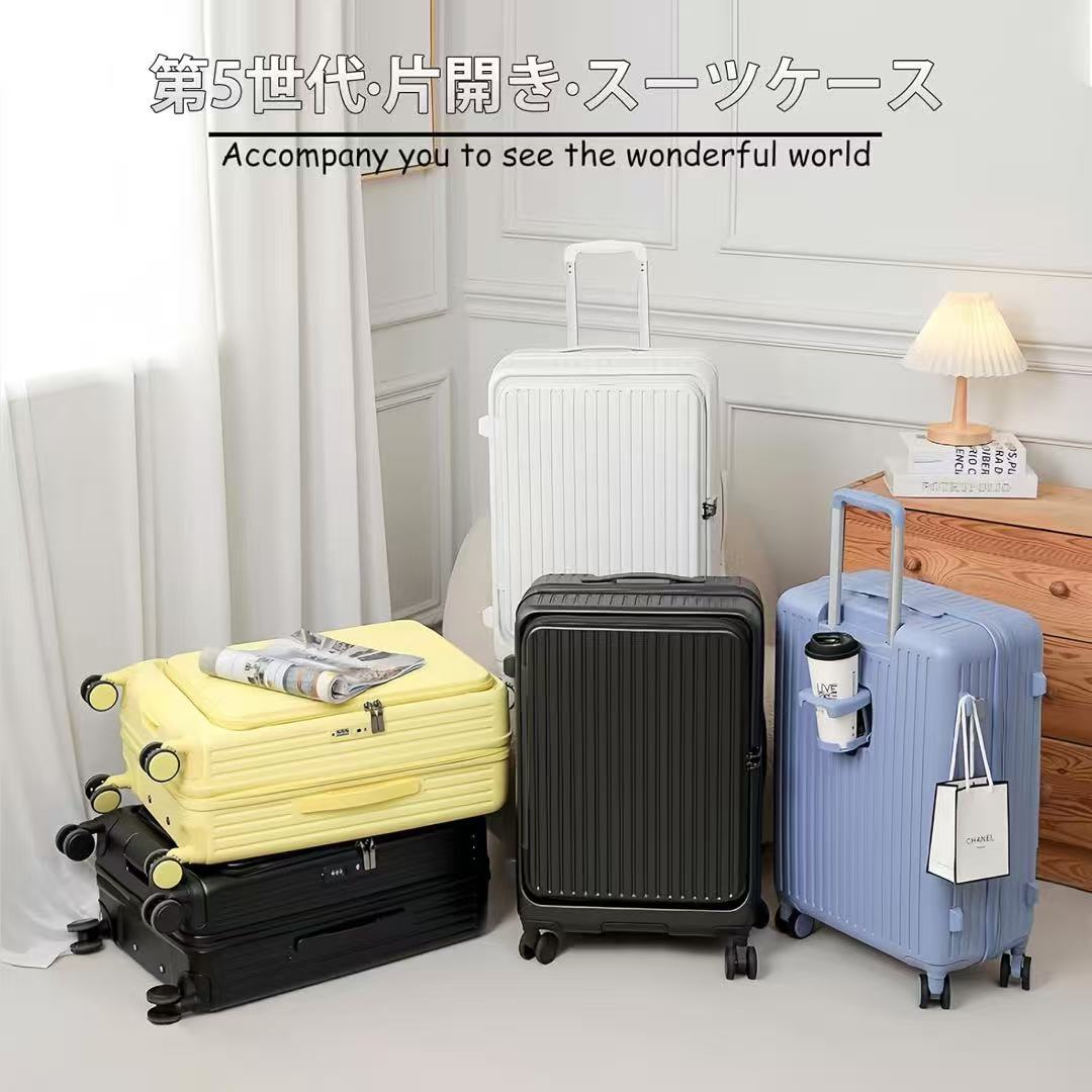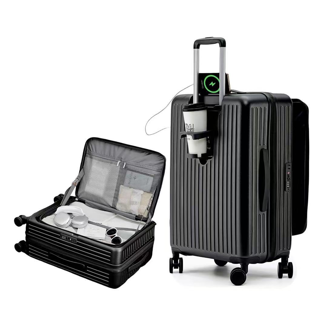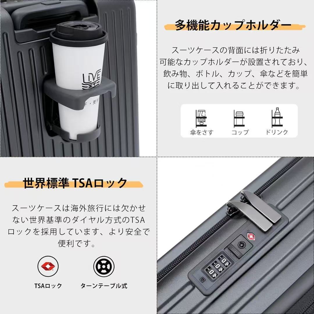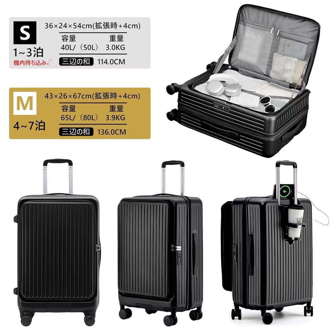 スーツケース Mサイズ キャリーケース 多機能 片開き 拡張機能付き キャリーバッグ フロントオープン USBポート付き カップホルダー付き