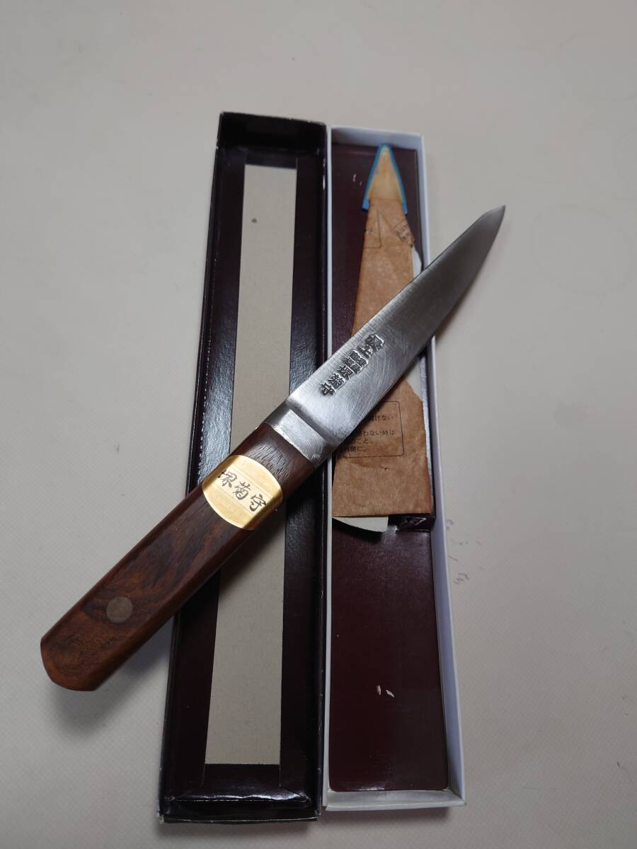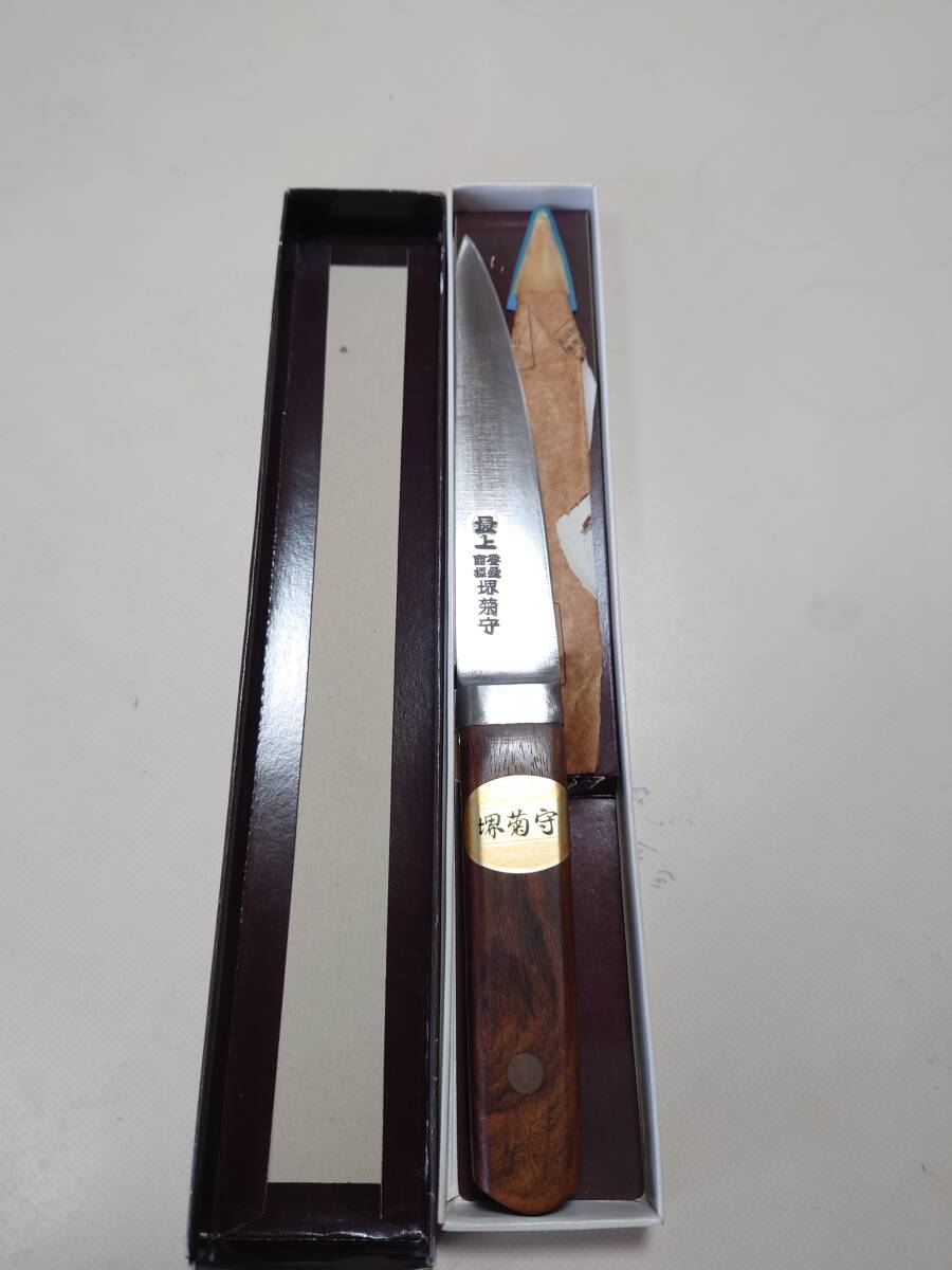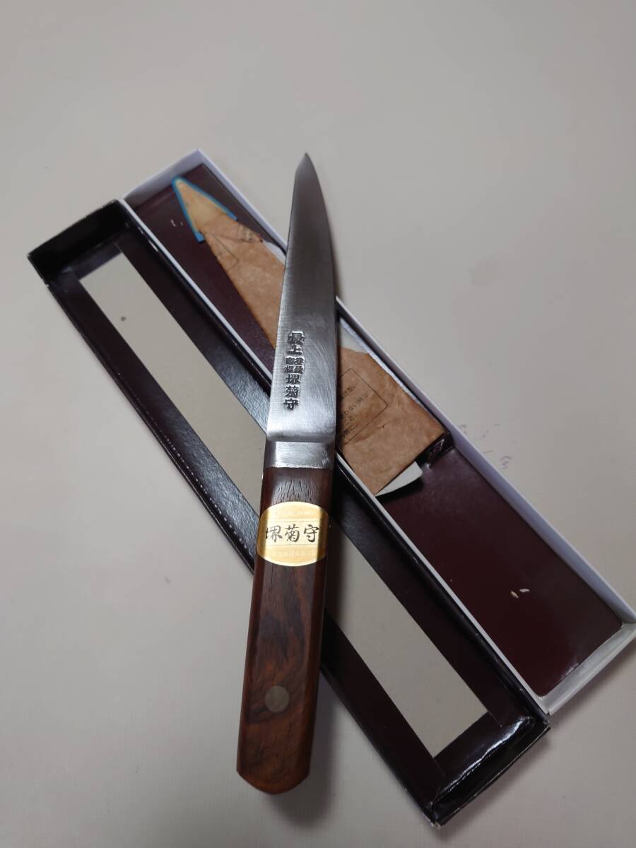 新品未使用の堺菊守スウェーデン鋼ツバ付き骨すき包丁です。さばき包丁とも呼ばれてると思います。