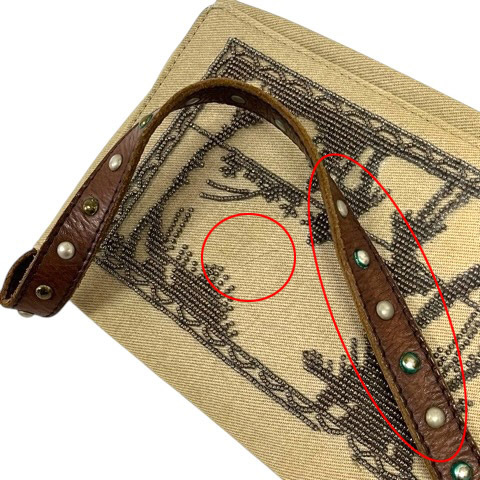 【状態】この商品には下記のようなダメージがあります。 ・バッグ底部にシミ汚れあり、角スレ3か所あり ・フラップ部分を中心にバッグ全体に細かな汚れ複数あり ・バッグ背部を中心に生地の糸の飛び出し、ほつれあり ・持ち手部分スタッズの変色あり ※全体的に中古品としての使用感と上記のようなダメージがありますが、通常使用には支障のない商品です。 掲載写真や記載内容をご確認いただき、ご理解の上ご購入ください。