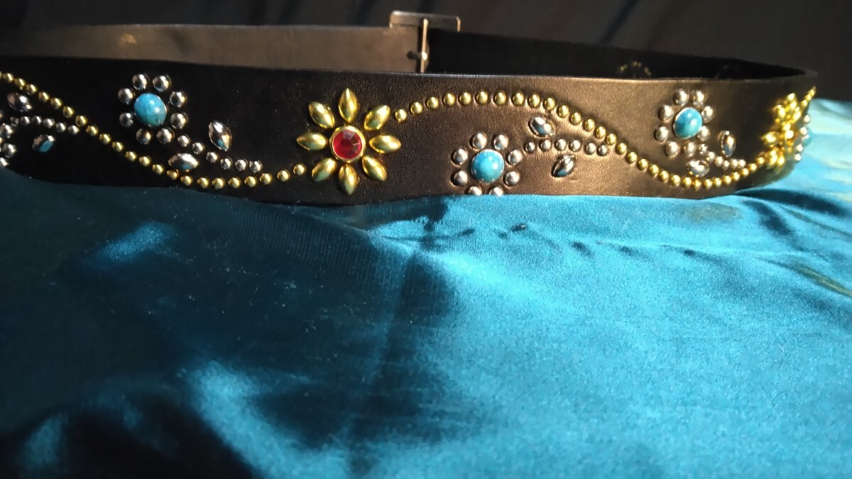 栃木レザーブラックベルトに、アメリカ老舗のスタンダードリベット社のスタッズを使いツタとフラワーをモチーフにしたスタッズベルトを製作しました。色はブラスとニッケル混合。