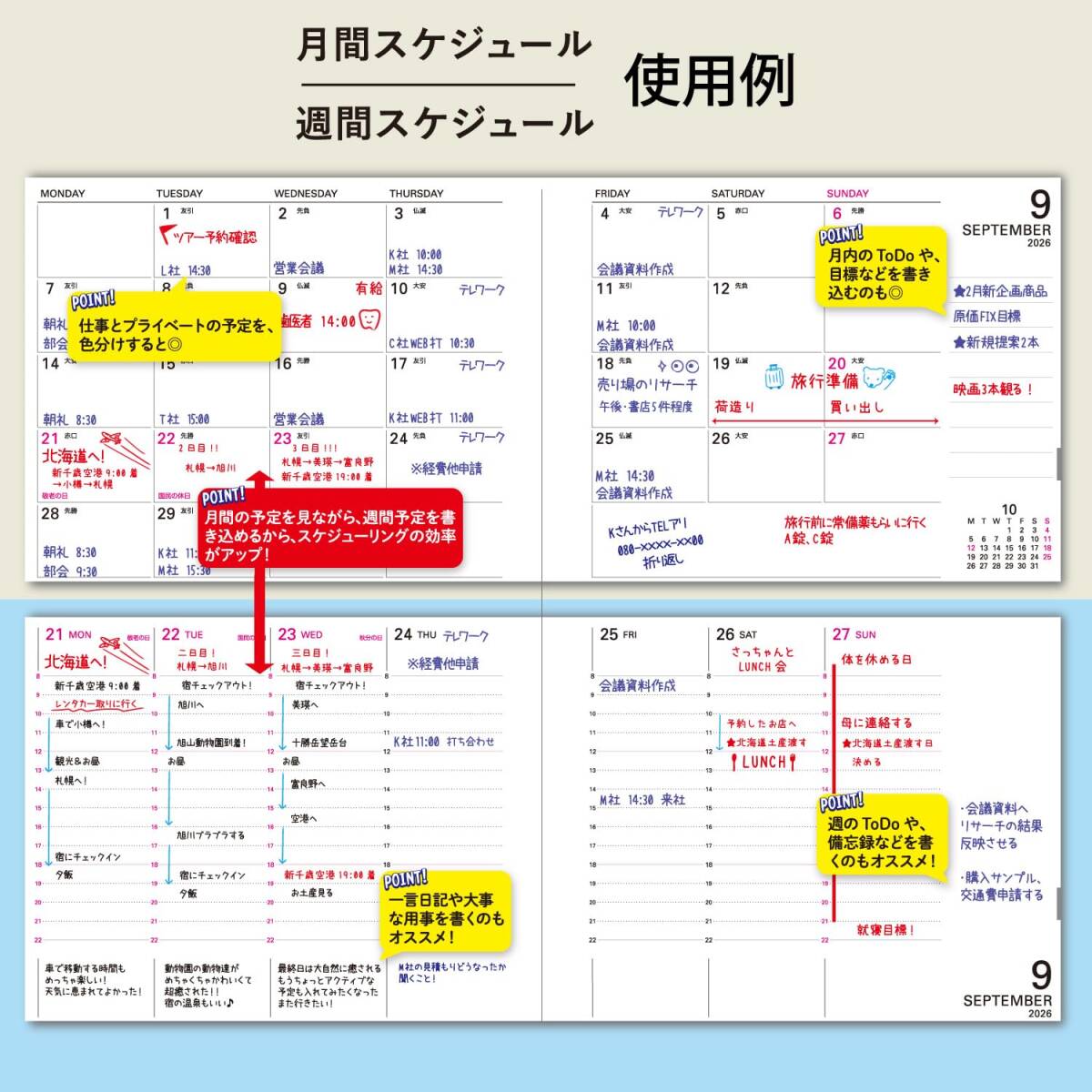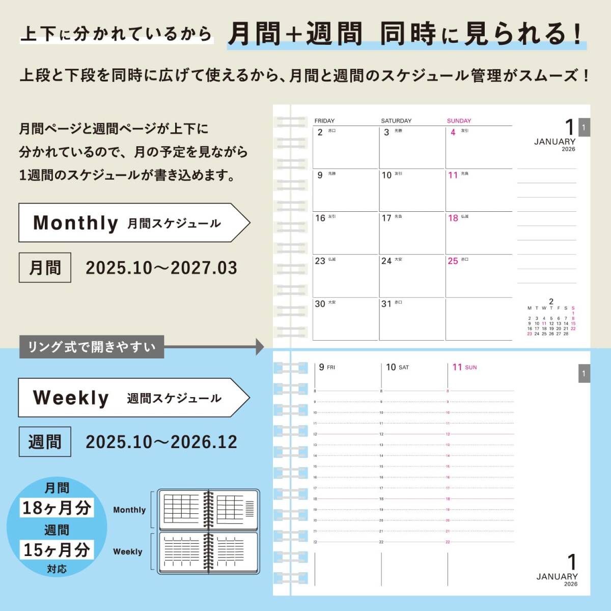 上下それぞれめくれるから月間・週間スケジュールを同時に確認できる。リング式でページを開きやすい仕様