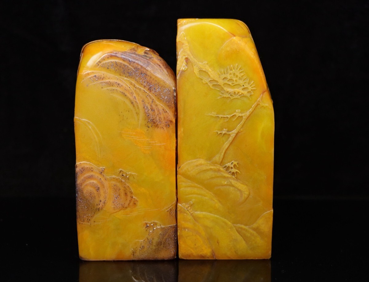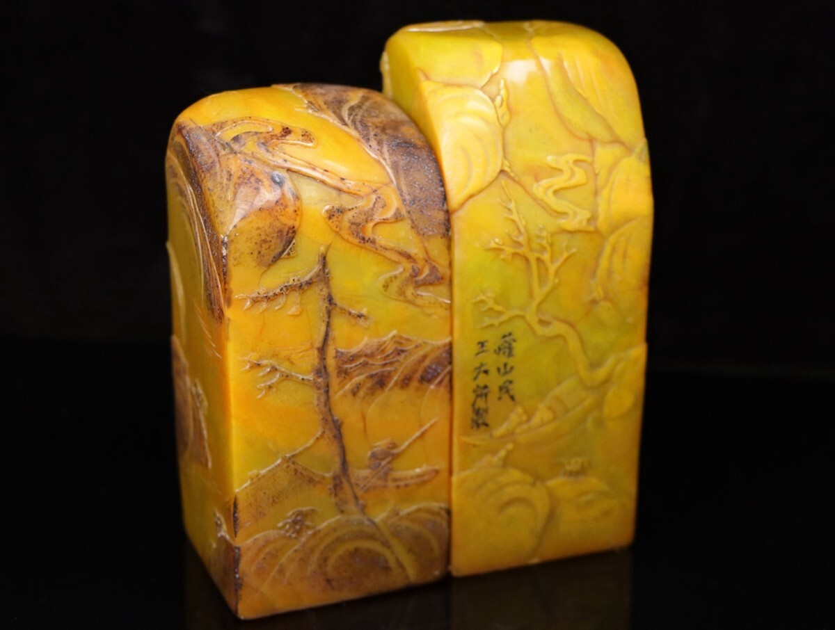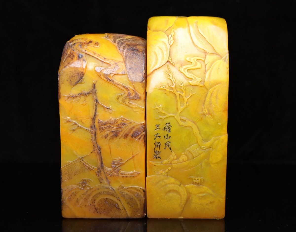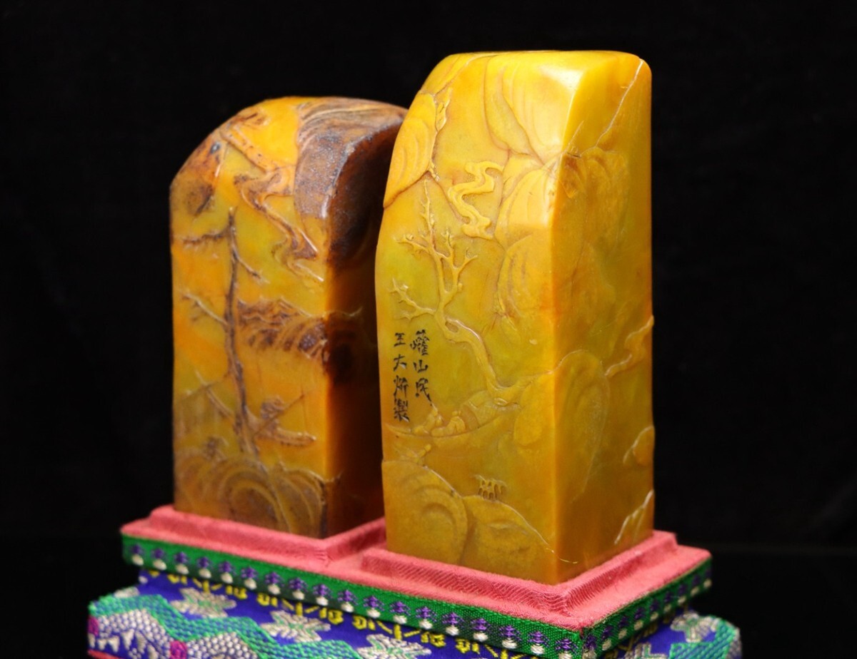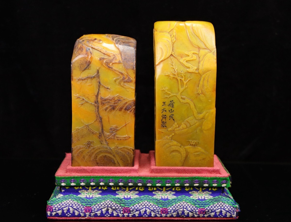 「清 王大きん 老寿山石 田黄石彫り 山水人物 閑章 印章」極細工 擺件 古賞物 中国古美術 旧蔵出