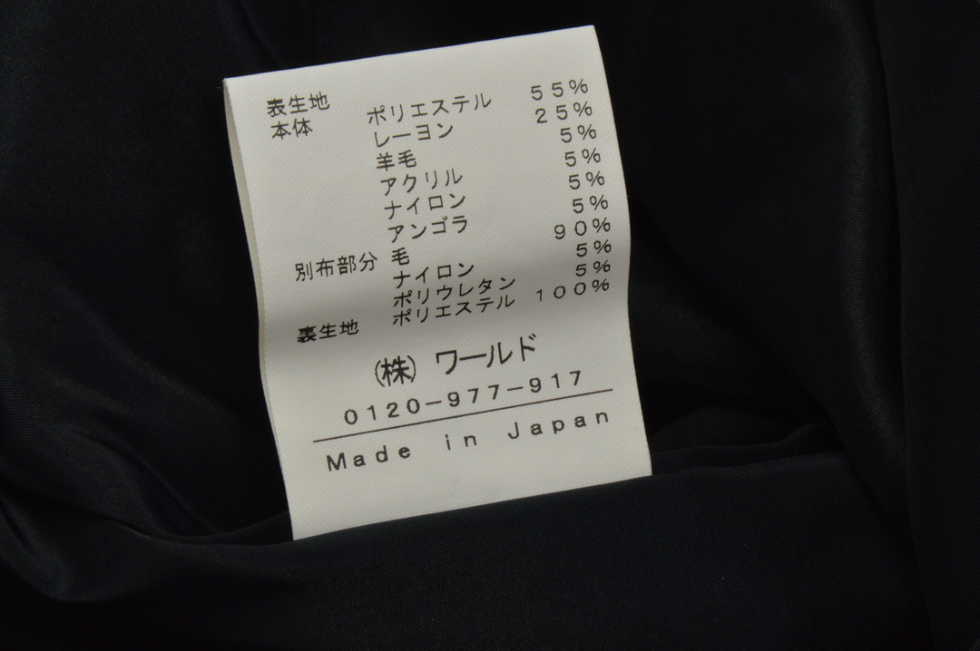 | ポリエステル:55% レーヨン:25% ウール:5% ナイロン:5% アクリル:5% アンゴラ:5% | |||||||||||